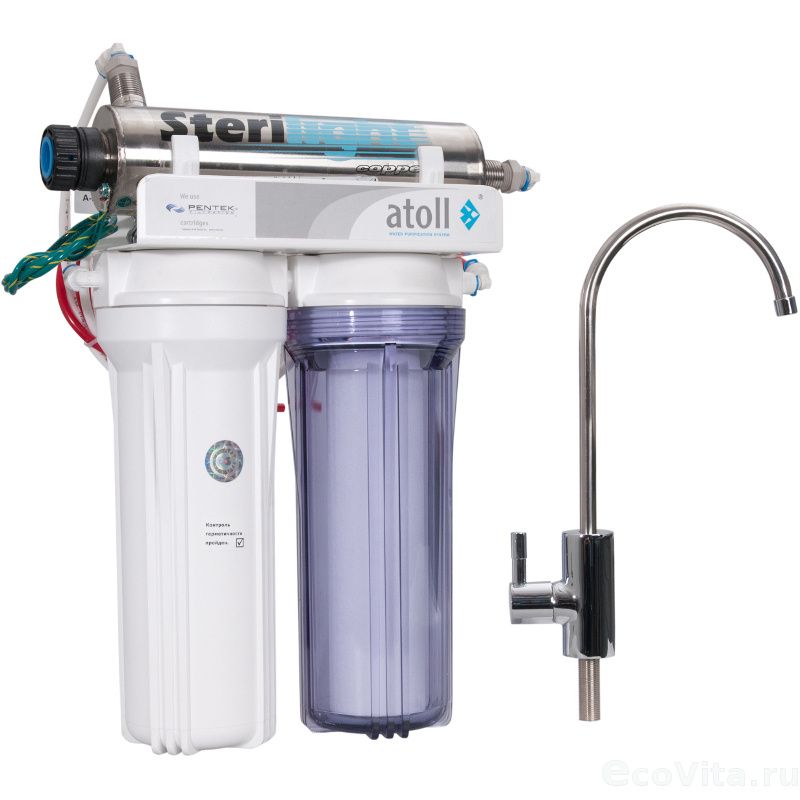 Проточная питьевая система Atoll D-21u STD (A-211Eu) с отдельным краном и УФ-лампой для питьевой воды. Фильтр предназначен для очистки воды от механических примесей, солей жесткости, хлора, органических соединений, пестицидов, вирусов и бактерий.