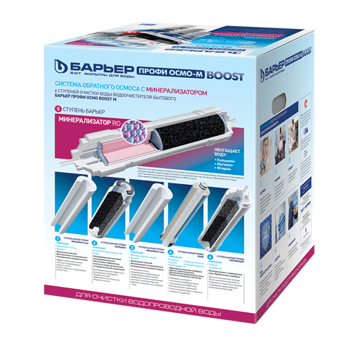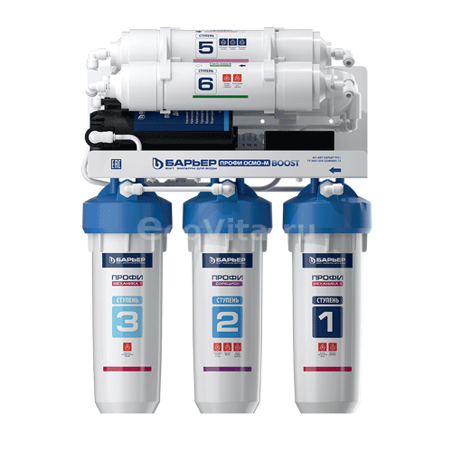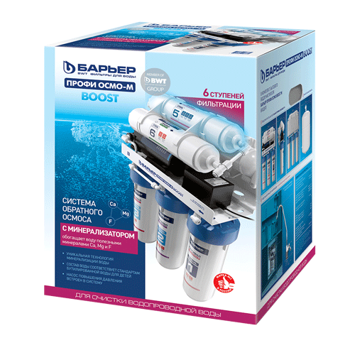 Фильтр Барьер Профи Осмо 100 Boost М на основе обратного осмоса с минерализатором и насосом повышения давления. Состоит из блока предфильтров, мембраны, накопительного бака, минерализатора, постфильтра, помпы для повышения давления. Обратный осмос обеспечивает очистки от всех примесей на 99,9%. Он удаляет из воды: хлор, хлорорганические соединения, нитраты, тяжелые и токсичные металлы, соли жесткости, нефтепродукты, бактерии и вирусы, механические загрязнения.