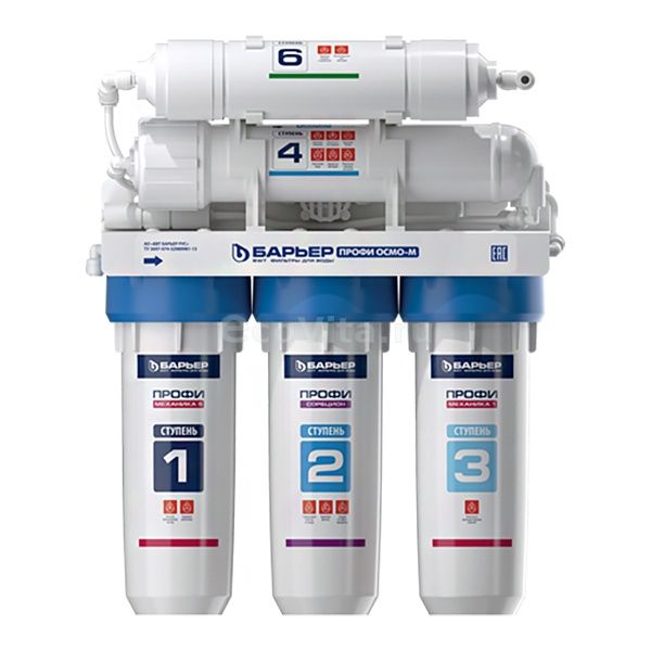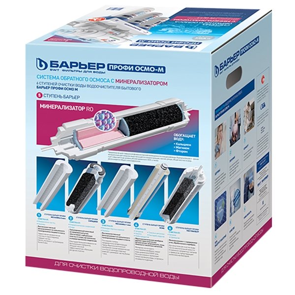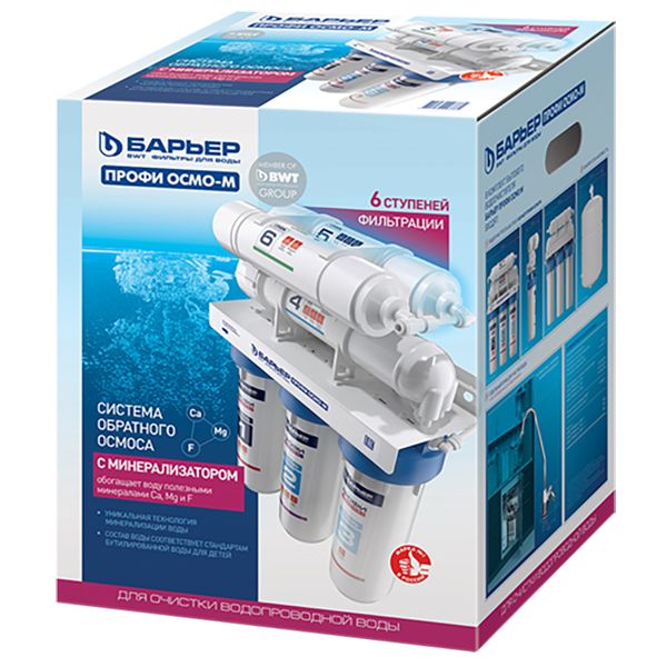 Фильтр Барьер Профи Осмо 100 М на основе обратного осмоса с минерализатором. Состоит из блока предфильтров, мембраны, накопительного бака, минерализатора и постфильтра. Обратный осмос обеспечивает очистки от всех примесей на 99,9%. Он удаляет из воды: хлор, хлорорганические соединения, нитраты, тяжелые и токсичные металлы, соли жесткости, нефтепродукты, бактерии и вирусы, механические загрязнения.