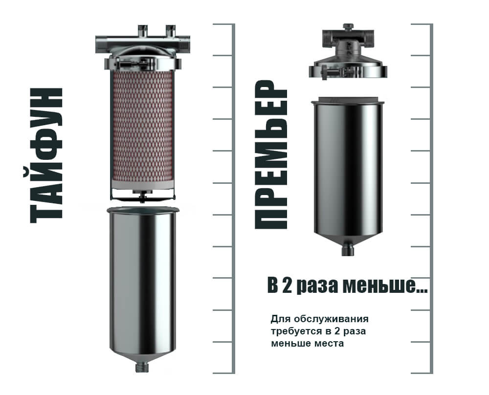В отличие от корпуса Тайфун, для для обслуживания и замены картриджа не нужно дополнительное пространство. Это позволяет устанавливать фильтр в меньшие по размеру места (ниши).