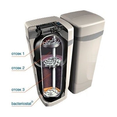 - уникальное вещество Бактериостат (Bacteriostat) предотвращает появление микроорганизмов в фильтрационном контейнере. Это позволяет проводить обеззараживание смолы реже, по сравнению с др. умягчителями;