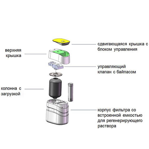 Умягчитель может быть подключен к магистрали и холодной, и горячей воды. Не требует использования сменных картриджей: для регенерации достаточно открыть верхнюю крышку на корпусе и засыпать необходимое количество соли.