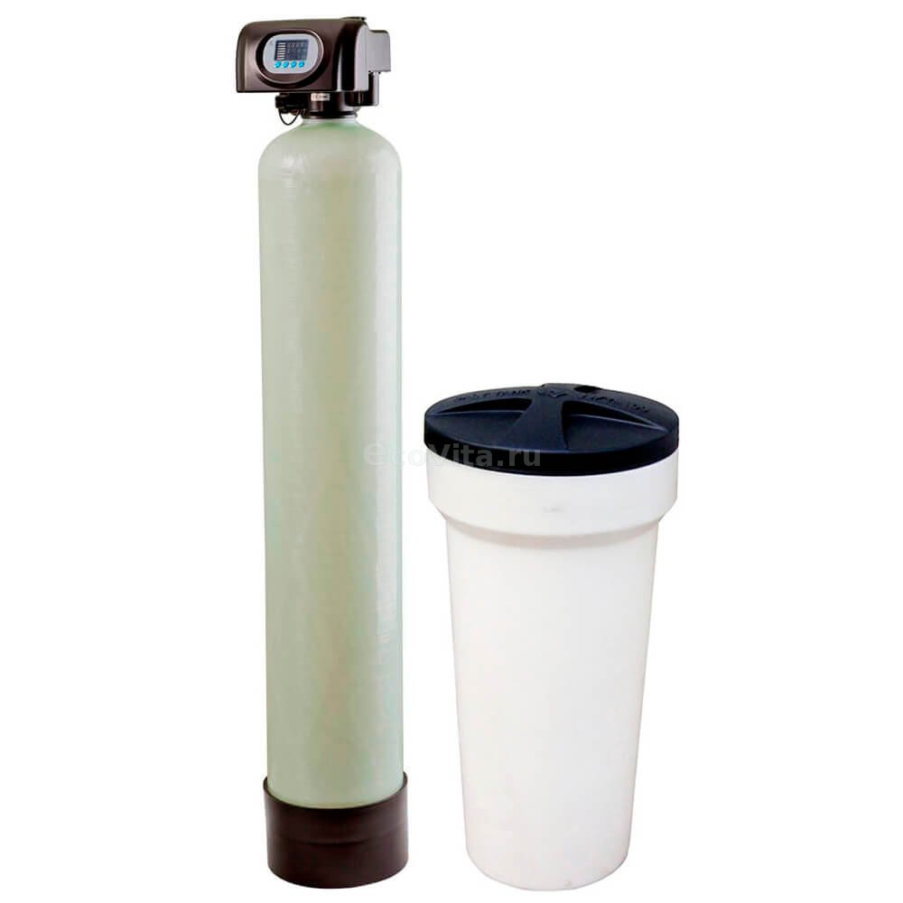 Умягчитель Ecovita EVS 18 RM с управлением по расходу воды. В зависимости от вида загрузки способен удалять соли жесткости, железо, марганец, органические вещества, тяжелые металлы и нитраты. Подходит для летней дачи и небольшого загородного дома.