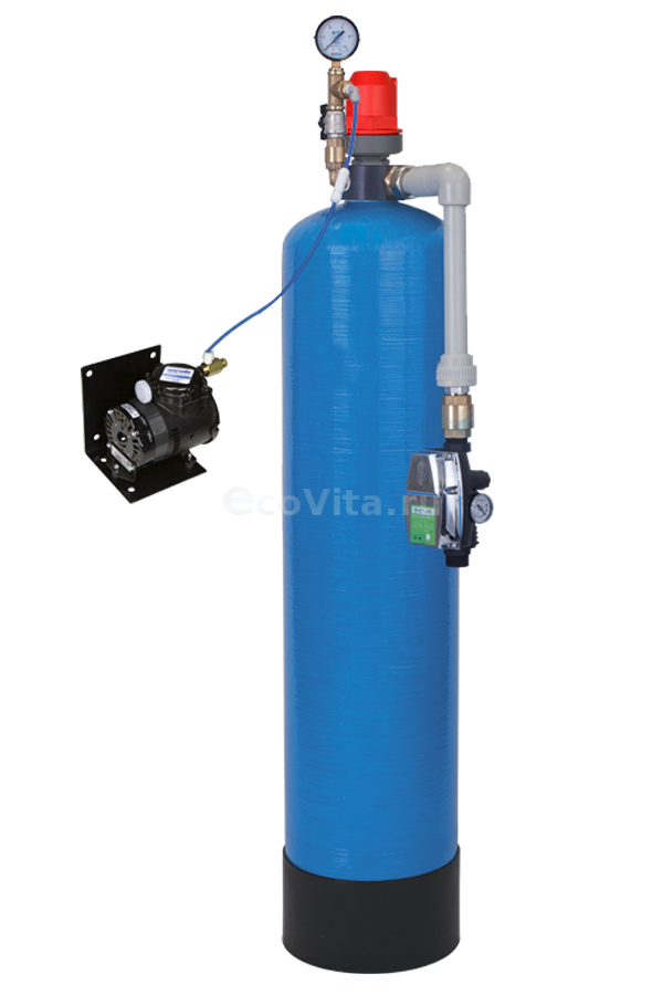 Воздух нагнетаемый в колонну компрессором вступает в реакцию с растворенными металлами и газами, затем аэрационной колонне происходит разделение воды и воздуха. Газы удаляются с помощью воздушного клапана в верхней части аэрационной колонны, а выпавшие в осадок металлы задерживаются фильтром.