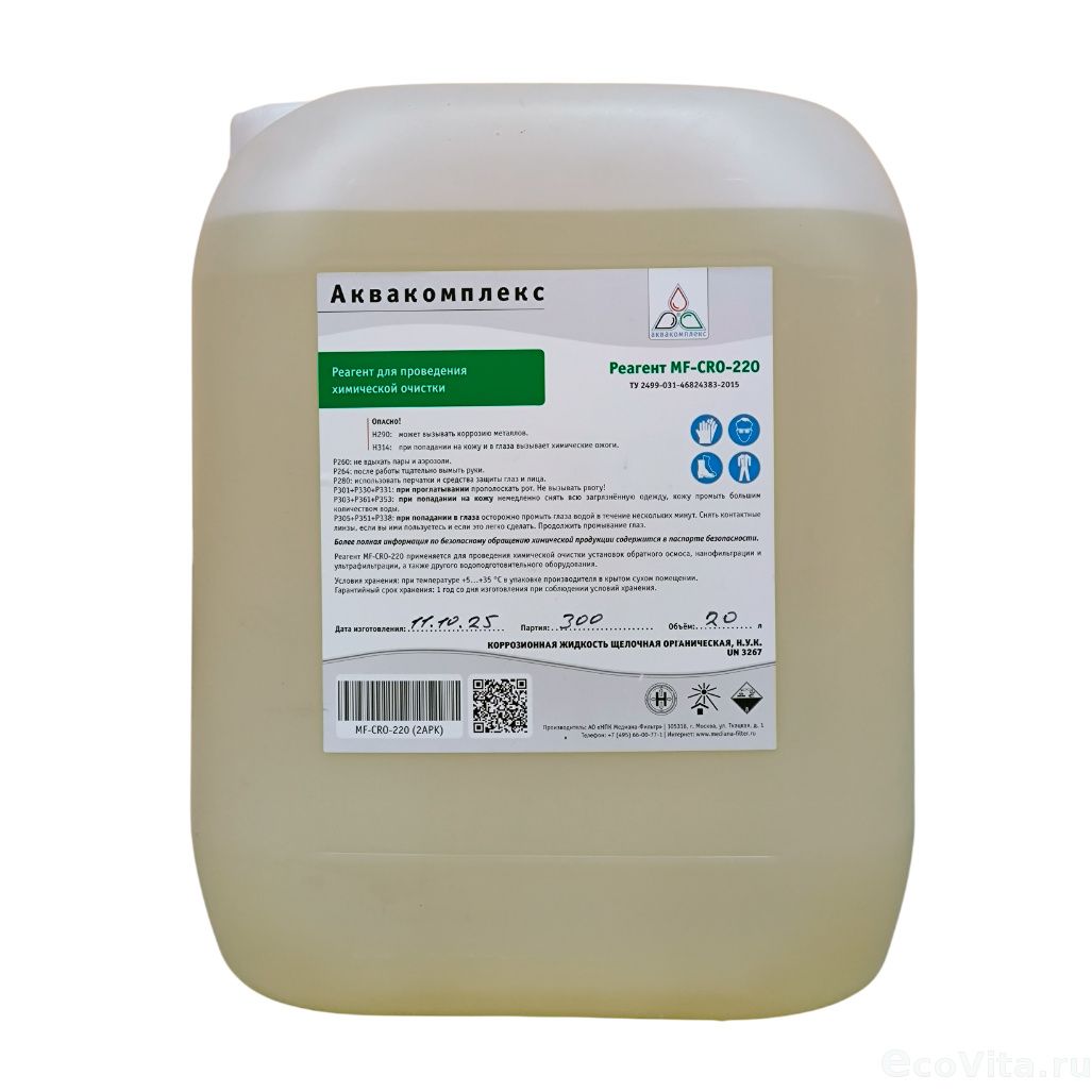 Реагент Аквакомплекс MF-CRO-220 20 л представляет собой концентрированный щелочной раствор, предназначенный для очистки обратноосмотических мембран.