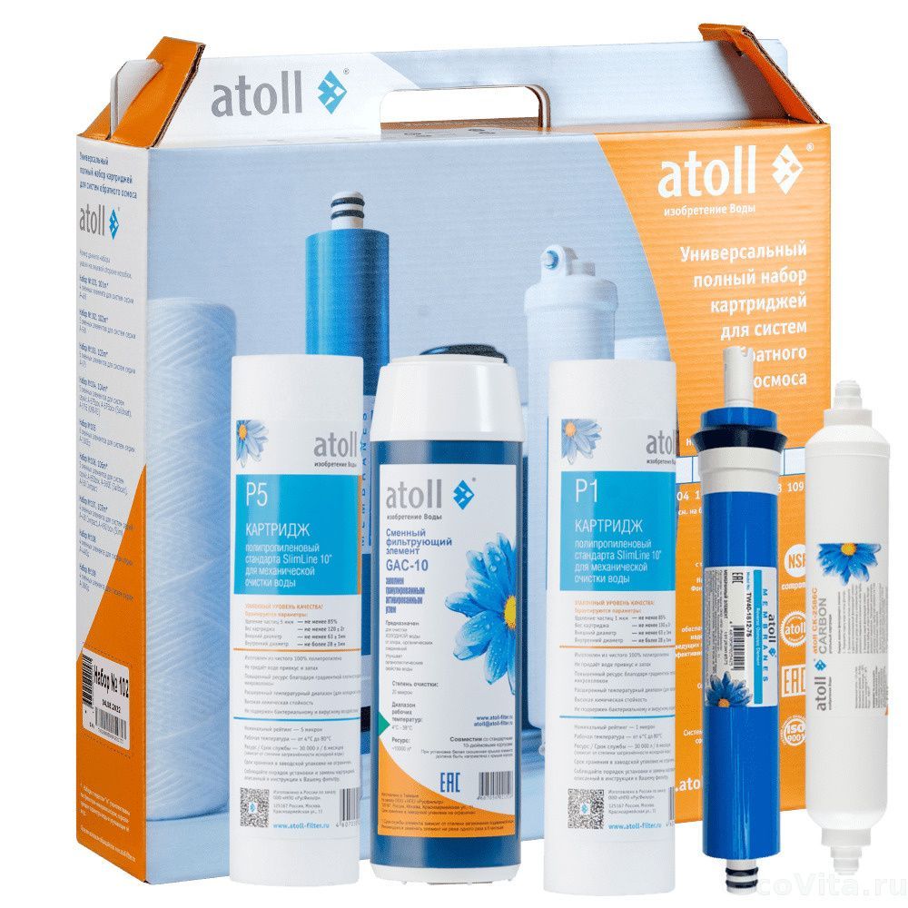 Полный набор картриджей Atoll №103 STDA предназначен для замены использованных элементов в системах обратного осмоса. Содержит 3 предфильтра, мембрану и постфильтр. Подходит для моделей A-575, A-575E, A-575Em, A-575E cp. Рекомендуемый срок замены: 24 месяца.