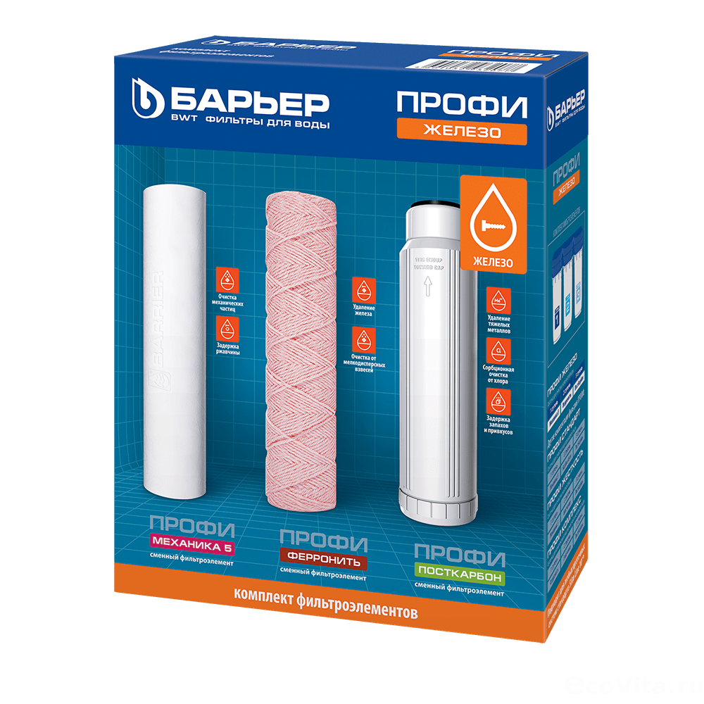 Комплект сменных элементов для системы Барьер ПРОФИ Железо осуществляет комплексную очистку жесткой воды от всех основных содержащихся в ней вредных примесей. Рекомендуемый период замены: 1 раз в 6 месяцев.