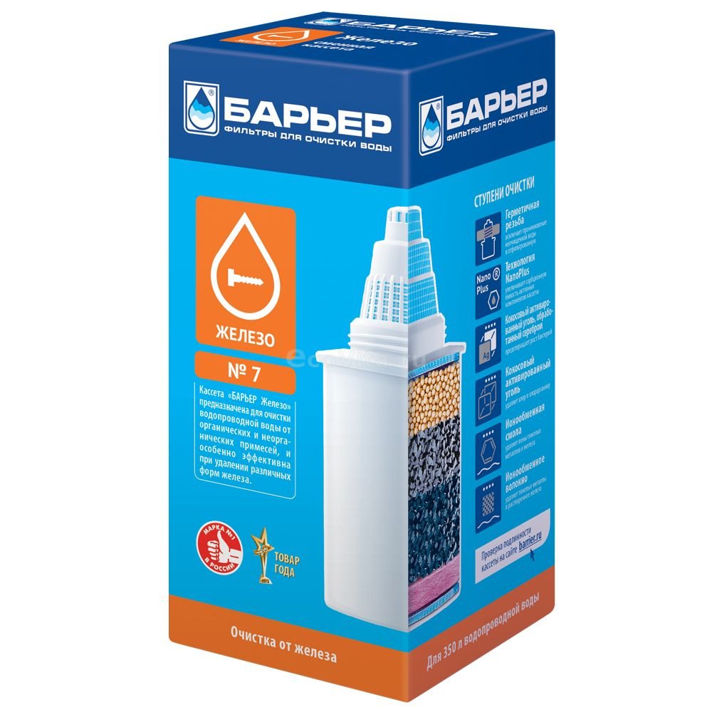 Сменный элемент (кассета) Барьер 7 Железо предназначен для очистки водопроводной воды от органических и неорганических примесей, активного хлора, побочных продуктов хлорирования. Особенно эффективен при удалении различных форм железа.