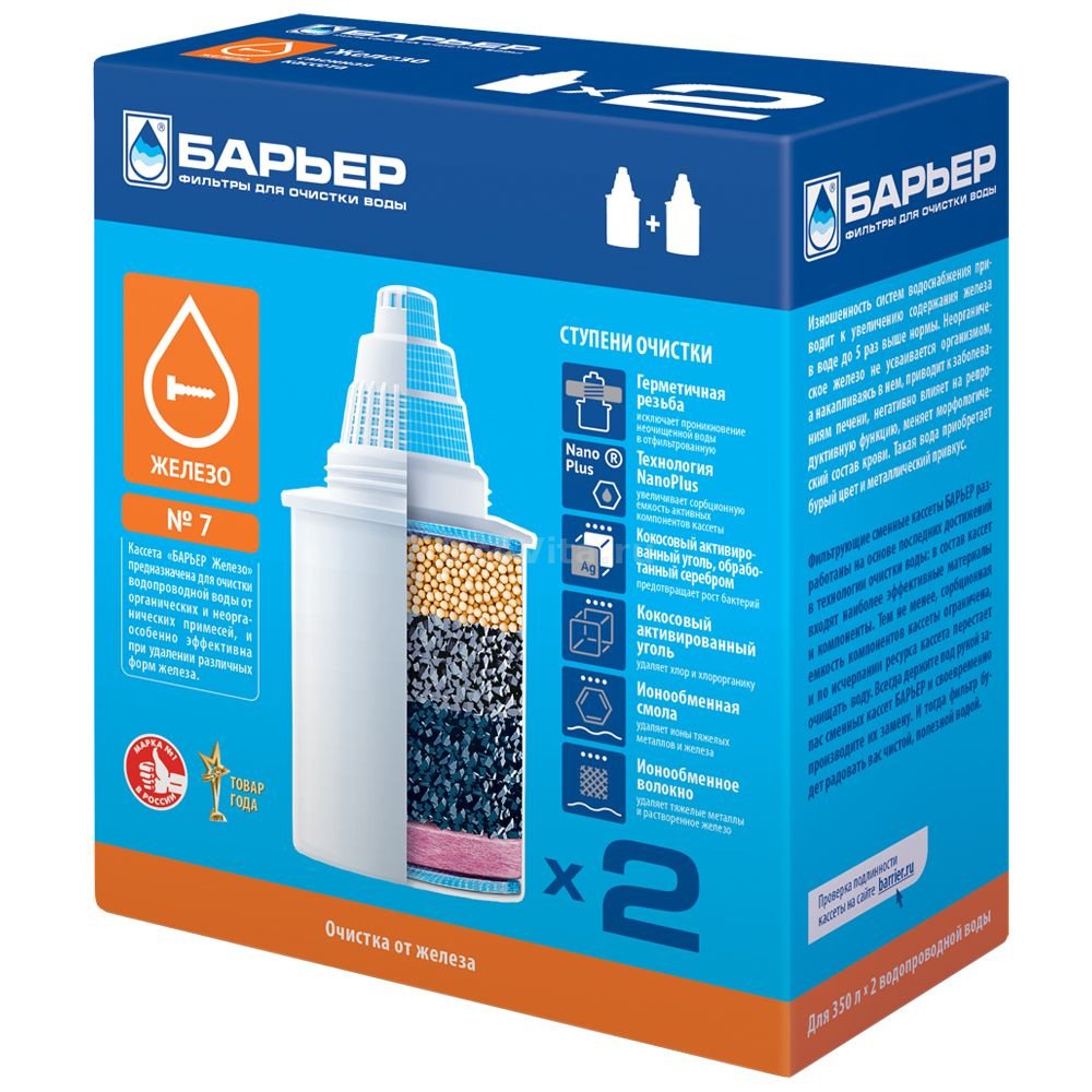 Комплект из 2-х сменных элементов (кассет) Барьер 7 Железо предназначен для очистки водопроводной воды от органических и неорганических примесей, активного хлора, побочных продуктов хлорирования. Особенно эффективен при удалении различных форм железа.