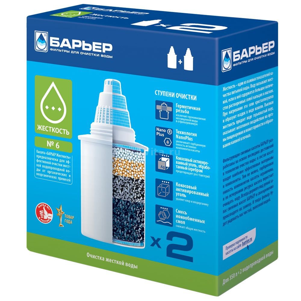 Комплект из 2-х сменных элементов (кассет) Барьер 6 Жесткость предназначен для высокоэффективной доочистки водопроводной воды от избыточной жесткости, органических и неорганических примесей, активного хлора, побочных продуктов хлорирования.