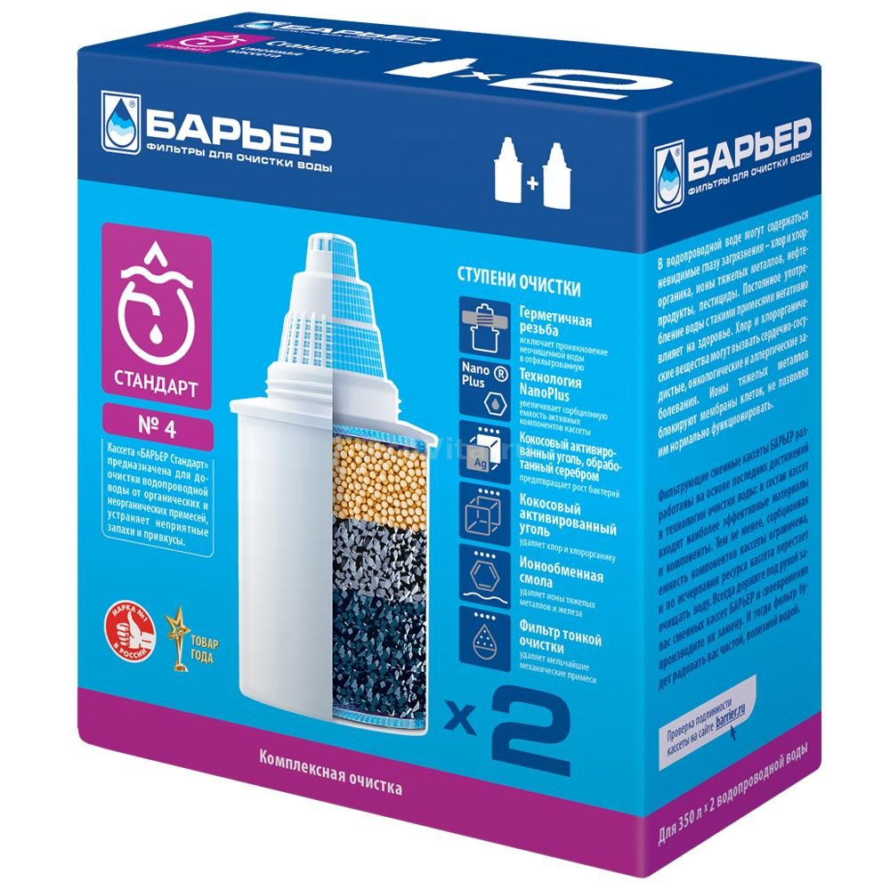 Комплект из 2-х сменных элементов Барьер 4 Стандарт предназначен для эффективной очистки водопроводной воды от органических и неорганических примесей, активного хлора, побочных продуктов хлорирования. Устраняет неприятные запахи и привкусы.