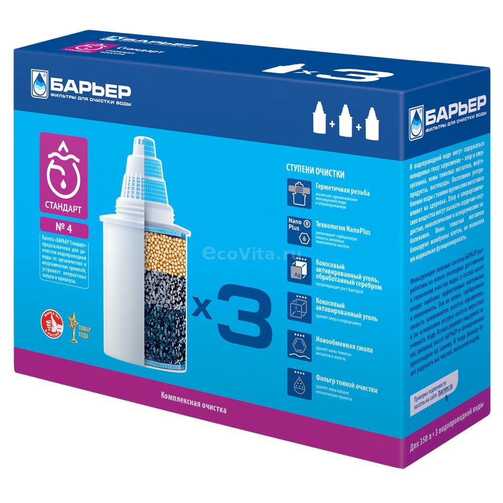 Комплект из 4-х сменных элементов Барьер 4 Стандарт предназначен для эффективной очистки водопроводной воды от органических и неорганических примесей, активного хлора, побочных продуктов хлорирования. Устраняет неприятные запахи и привкусы.