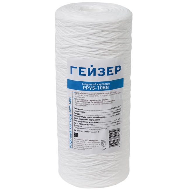 Сменный картридж Гейзер PPY 5-10BB предназначен для механической очистки воды от нерастворимых примесей. Картридж изготовленный из полипропиленового шнура фильтрует воду от ржавчины, грязи, песка и других примесей размерами более 5 мкм. Использованный картридж не подлежит восстановлению и регенерации. После окончания ресурса требуется замена на новый. PPY 5-10BB применяется в бытовых фильтрах Гейзер.