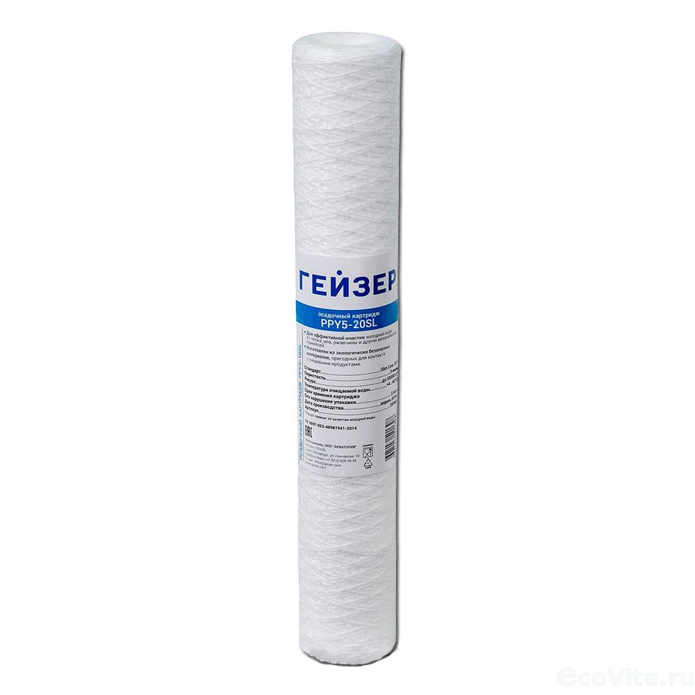 Сменный картридж Гейзер PPY 5-20SL предназначен для механической очистки воды от нерастворимых примесей. Картридж изготовленный из полипропиленового шнура фильтрует воду от ржавчины, грязи, песка и других примесей размерами более 5 мкм. Использованный картридж не подлежит восстановлению и регенерации. После окончания ресурса требуется замена на новый.