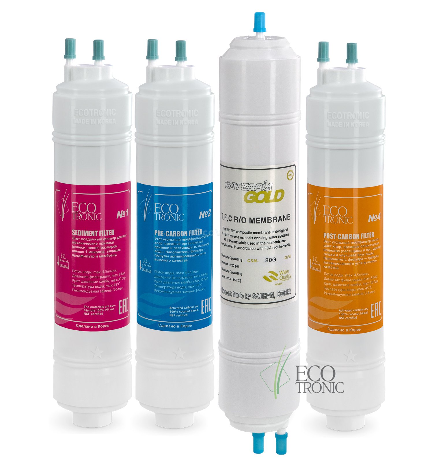 Комплект фильтров Ecotronic 12" с обратноосмотической (RO) мембраной для настольных и напольных пурифайеров. Предназначен для эффективной очистки воды (до 99,9%) от вредных примесей и микроорганизмов.