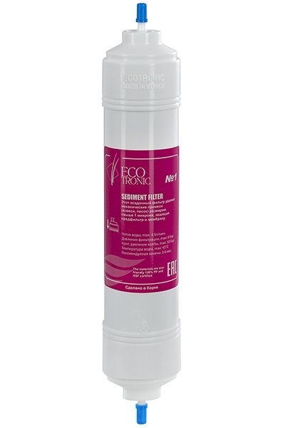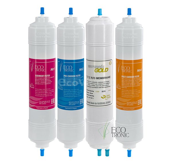 Комплект фильтров Ecotronic 14" с обратноосмотической (RO) мембраной для настольных и напольных пурифайеров. Предназначен для эффективной очистки воды (до 99,9%) от вредных примесей и микроорганизмов.