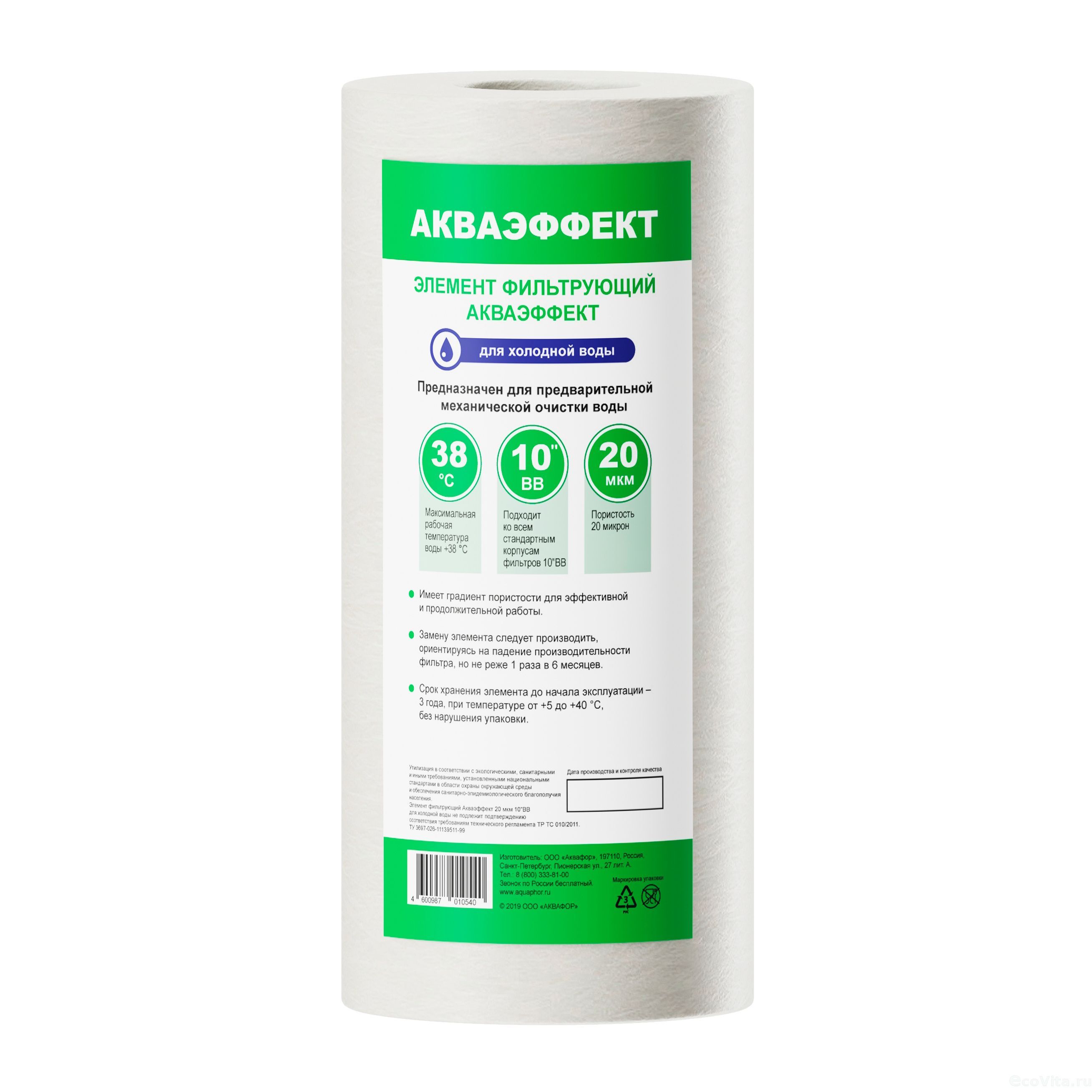 Сменный модуль Аквафор Акваэффект 20 мкм 10"BB из полипропилена предназначен для предварительной фильтрации холодной воды.