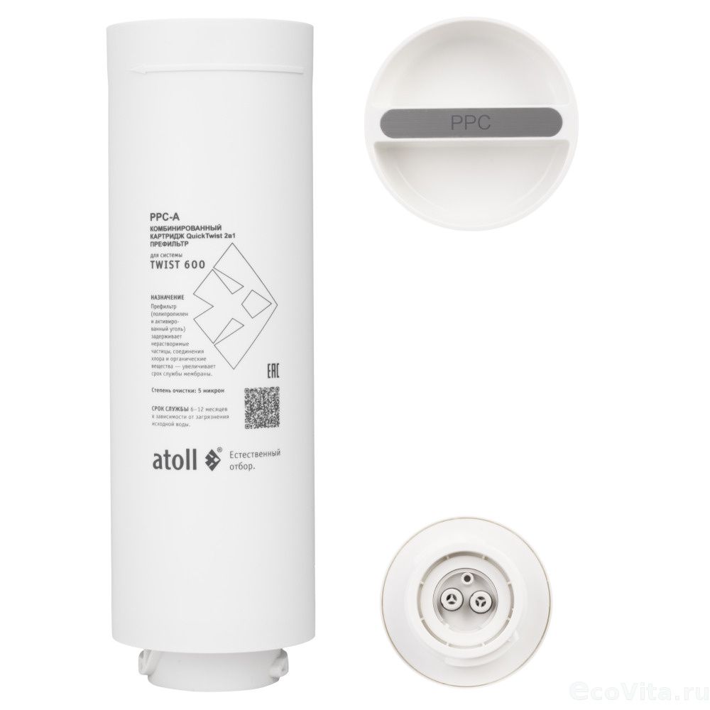 Картридж Atoll TWIST 600 PPC-A (2 в 1) для системы обратного осмоса atoll TWIST 600. Картридж выполнен в стандарте QuickTwist, которые можно менять легким движением руки, не отключая систему от воды.
