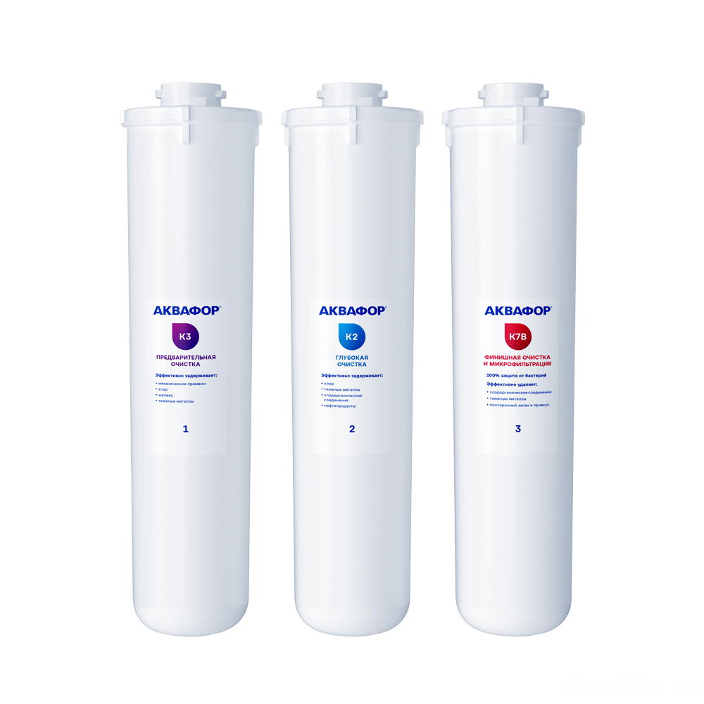 Комплект включает три сменных картриджа: K3, K2 и K7B, которые очищают воду, удаляя частицы размерами более 5, 0,8 и 0,1 мкм соответственно.