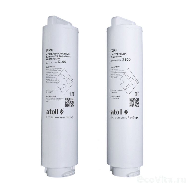 - Картридж Atoll X100 CPF – постфильтр. Выполнен из высокопористого активированного угля, полученного из скорлупы кокосового ореха, что позволяет эффективно устранять посторонние запахи и улучшать вкус воды, одновременно очищая жидкость от остаточного содержания растворённых газов и органических примесей.