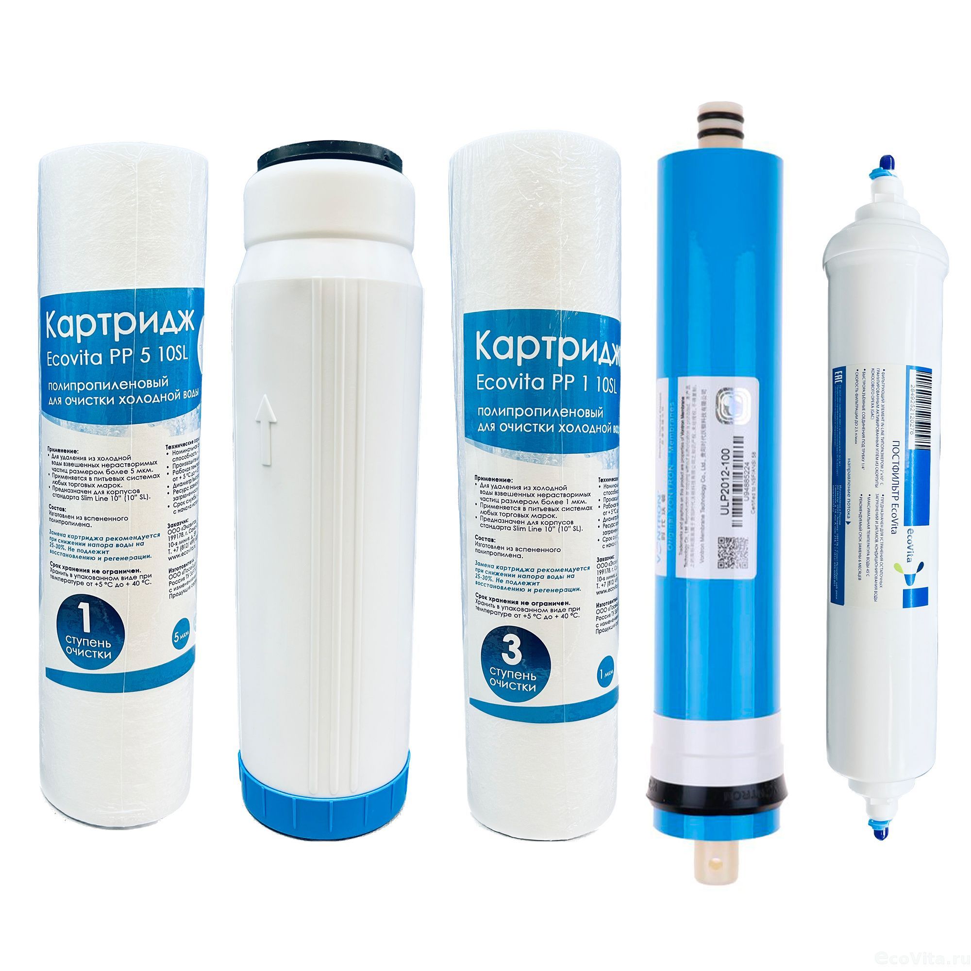 Набор картриджей Ecovita Osmo 5-100 для замены сменных модулей в системах обратного осмоса. Содержит 3 предфильтра, обратноосмотическую мембрану и постфильтр. Подходит для всех классических обратноосмотических систем торговых марок Atoll (Aтолл), Гейзер, Аквафор, Барьер, Ecosoft (Экософт) и т.д. Рекомендуемый срок замены: 24 месяца.