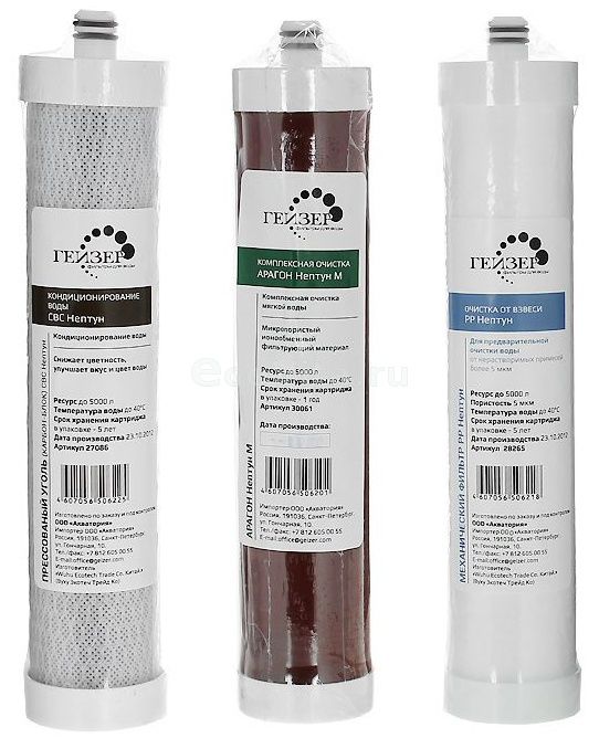 Комплект сменных картриджей Гейзер №12 предназначен для фильтров Гейзер Нептун М. Для очистки мягкой воды.
