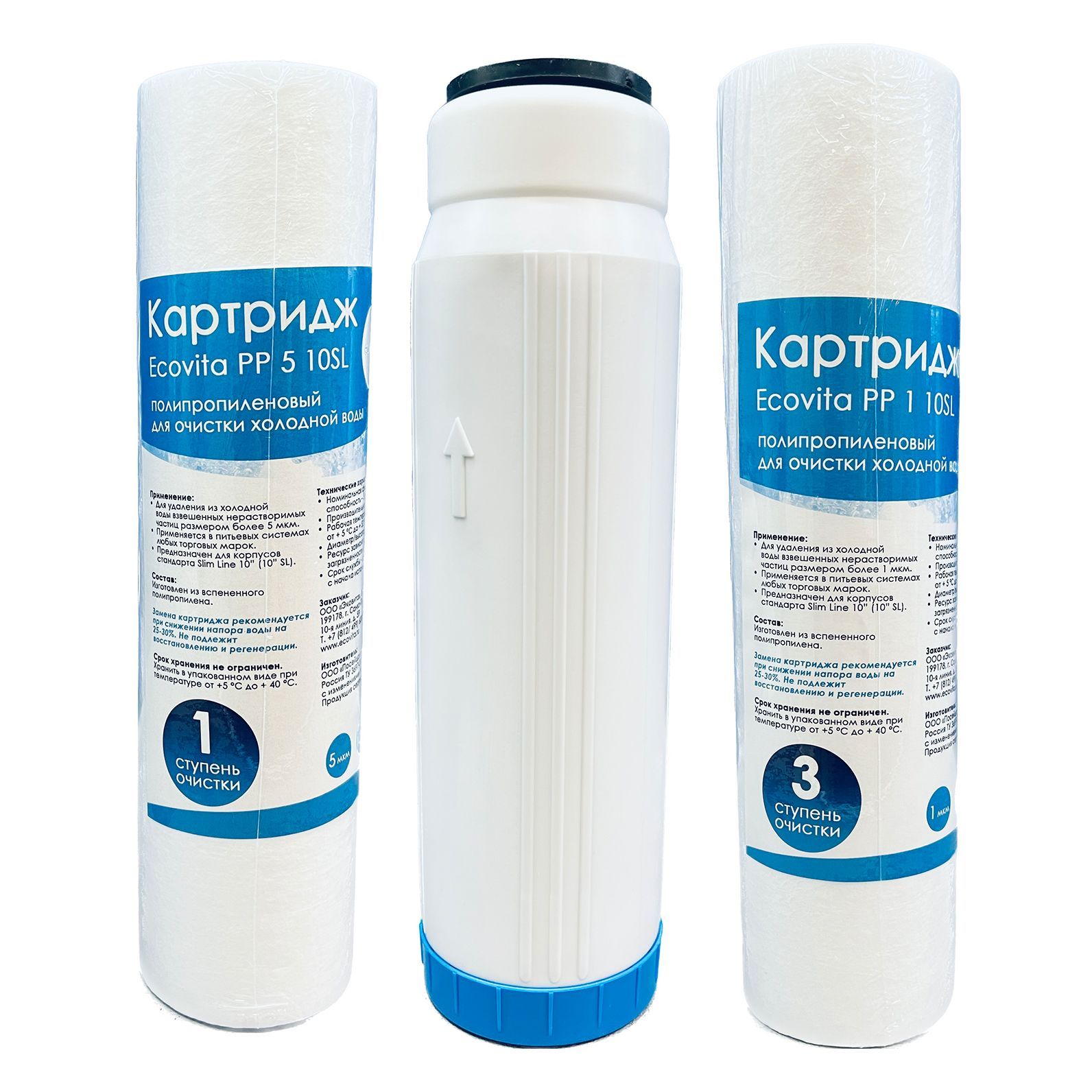 - Сменный модуль Ecovita PP 1 10SL - удаляет механические примеси (песок, ржавчина, окалина, осадок и др. нерастворимые частицы). Тонкость фильтрации 1 микрон.