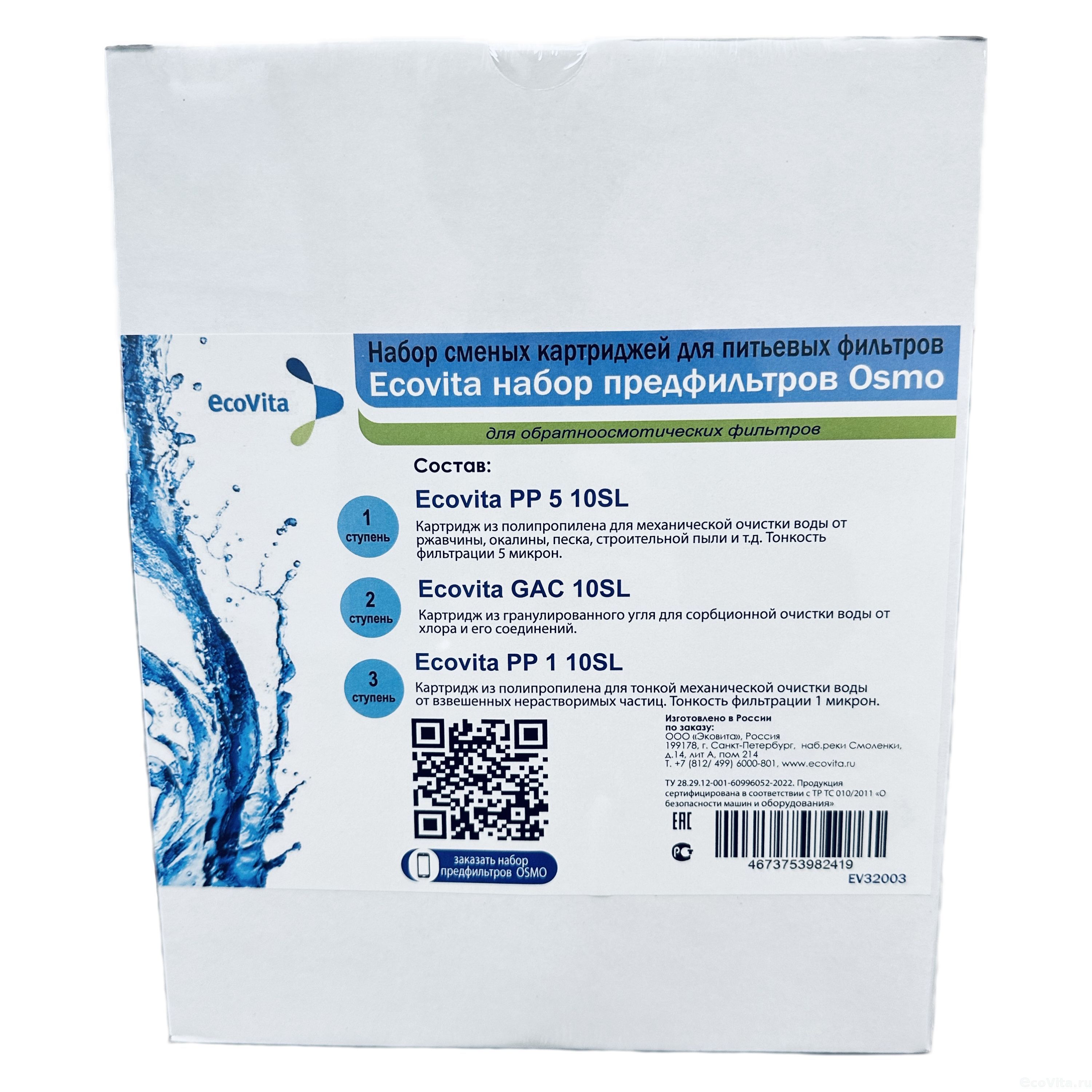 Набор предфильтров Ecovita Osmo состоит из двух механических картриджей 1 и 5 мкм и угольного картриджа. Комплект подходит для классических обратноосмотических систем любой торговой марки с колбами стандарта 10"SL.