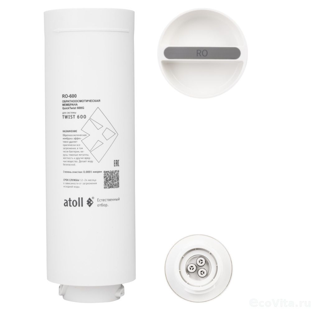 Мощная обратноосмотическая мембрана Atoll TWIST 600 производит в минуту более 1.5 литров чистой питьевой воды в минуту (производительность 600 галлон в день). Картридж выполнен в стандарте Quick Twist., которые можно менять легким движением руки, не отключая систему от воды. Подходит к фильтрам других производителей.