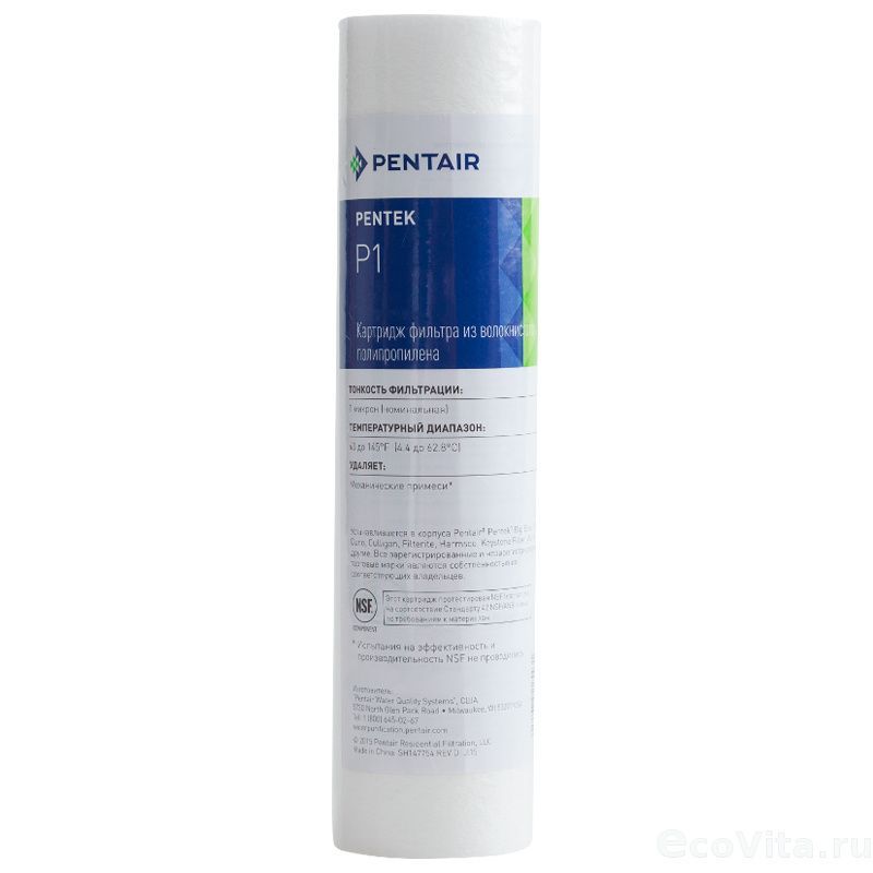 Картридж Pentair (Pentek) P1 с учетом возрастания плотности волокон полипропилена от внешней поверхности к внутренней. Это обеспечивает постепенную фильтрацию сначала более крупных, а затем более мелких частиц. Благодаря этому улучшается качество процесса водоочистки и увеличивается срок службы картриджа. Полипропиленовые волокна не привносят в воду дополнительных вкусов, запахов и окрашенности. Жесткость конструкции достигается за счет формы плетения, создающего твердую матрицу, в результате чего фильтр не нуждается в сердечнике.