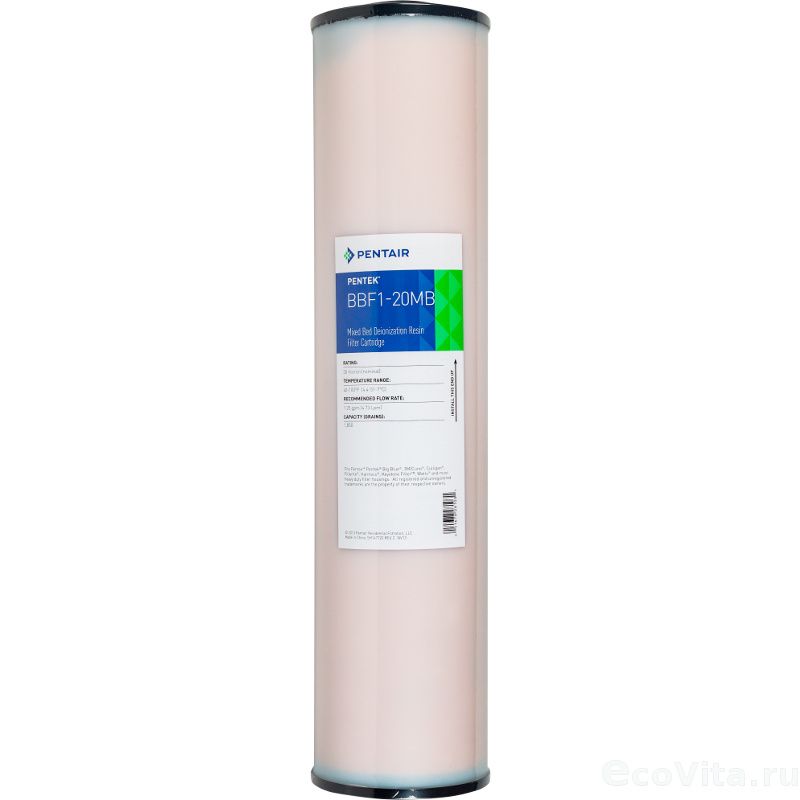 Картридж Pentair (Pentek) F1-20MB BB FDA D.I. Resin предназначен для деионизации воды. Изготовлен с использованием специальной смолы состоящей из смеси катионита и анионита высокой чистоты. Применяются в качестве постфильтра в многоступенчатых системах очистки воды. На конечном этапе очистки минимизирует суммарное содержание органических углеродов и суммарное содержание растворенных солей до уровня электрического сопротивления 16 Mom.