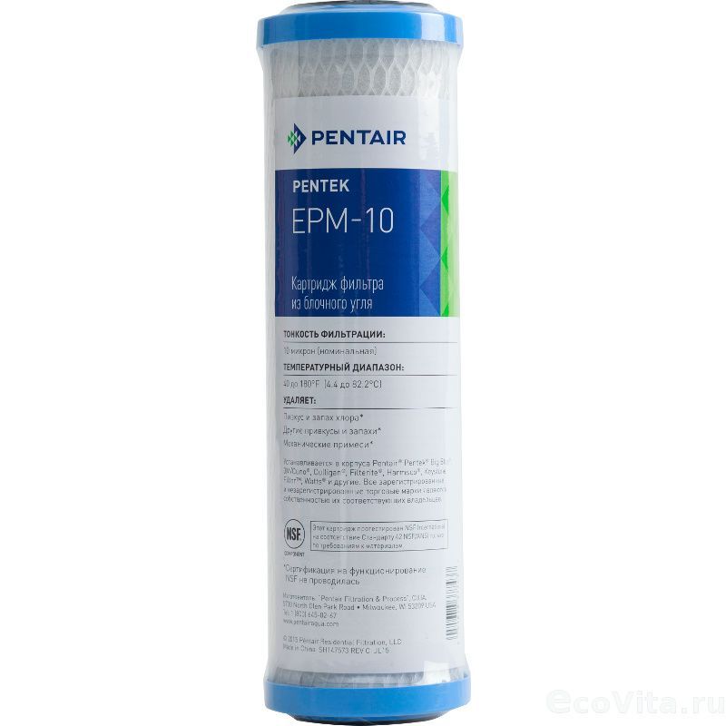 Картридж Pentair (Pentek) EPM-10 являются модификацией серии EP. Уникальная технология изготовления и специальная структура угля дает преимущество при фильтрации хлора, по сравнению с другими 10-микронными угольными сменными элементами, причем потеря давления внутри сменного элемента незначительна. Сочетает увеличенный срок службы прессованного угольного блока с высокой фильтрационной способностью.
