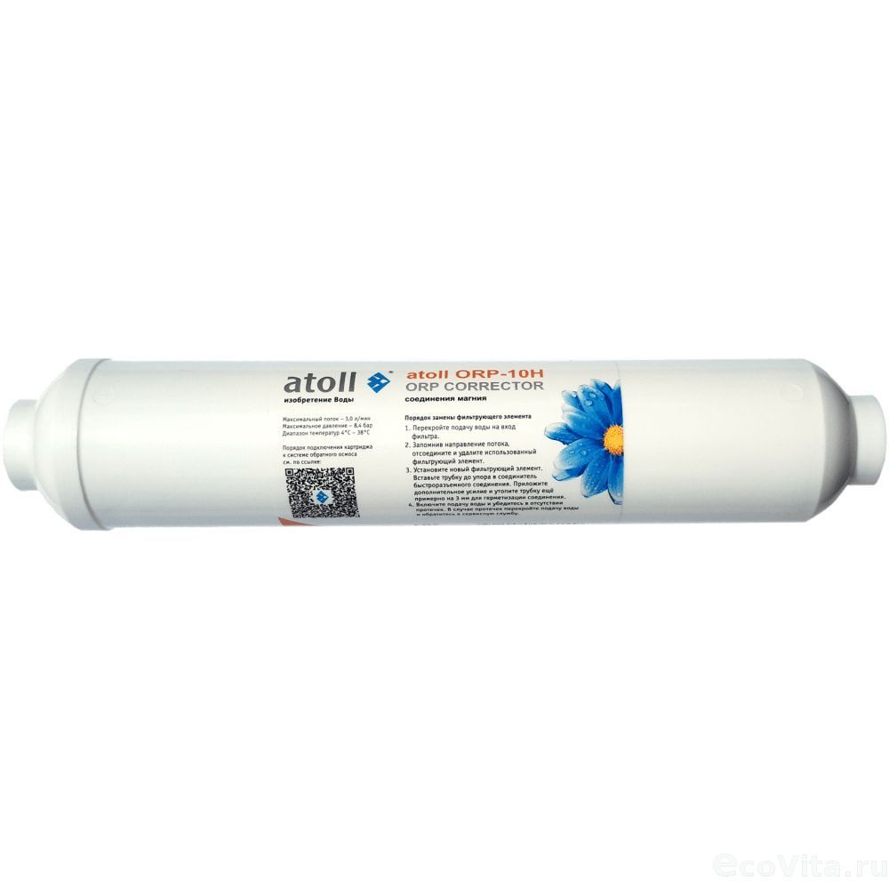 Корректор ОВП Atoll ORP-10H предназначен для обработки воды очищенной обратноосмотической мембраной. Картридж снижает значение Окислительно-Восстановительный потенциал воды до отрицательных значений, повышает содержание ионов магния, корректирует pH, насыщает воду водородом, делает воду вкусной и полезной.