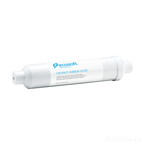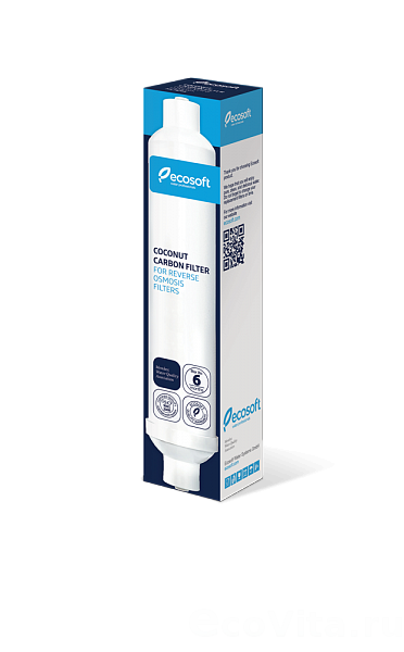 Угольный постфильтр Ecosoft содержит гранулированный активированный уголь из скорлупы кокосовых орехов. Корректирует вкус и запах очищенной воды.