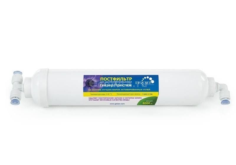 Угольный постфильтр Гейзер используется для доочистки и кондиционирования воды, очищенной системой обратного осмоса. Удаляет посторонние привкусы и запахи, которые могут появиться при длительном хранении воды в гидроаккумуляторе (баке для отфильтрованной воды).