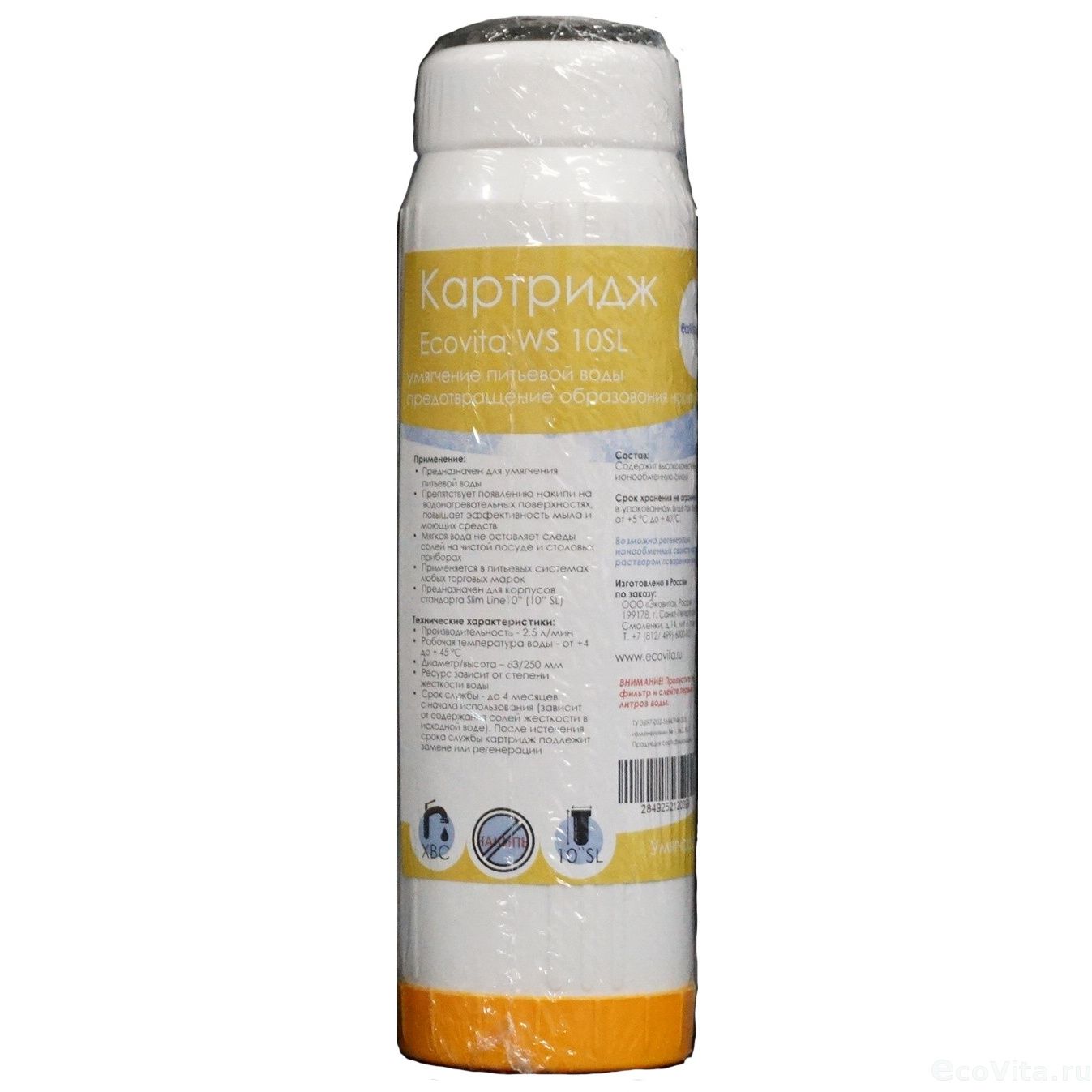 Cменный фильтрующий элемент Ecovita WS стандарта Slim Line 10" предназначен для удаления солей жесткости и умягчения воды. Картридж также способствует защите нагревательных элементов и сантехники от образования накипи и отложений.