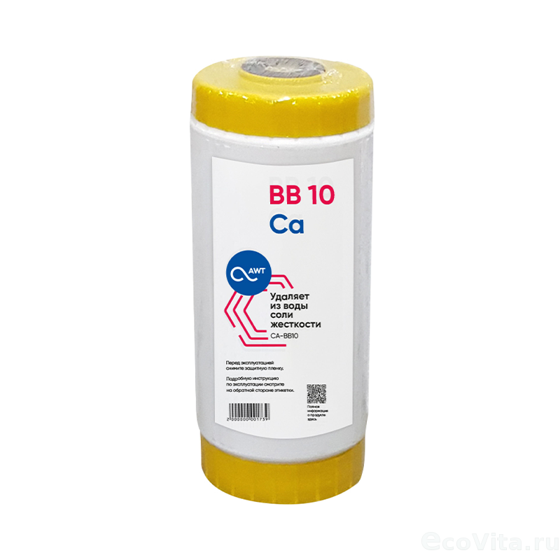 Умягчающий картридж AWT CA-BB10" предназначен для удаления из воды избыточных солей жесткости (кальция, магния), железа, марганца, других тяжелых металлов. Фильтрующая способность картриджа восстанавливается после регенерации раствором поваренной соли.
