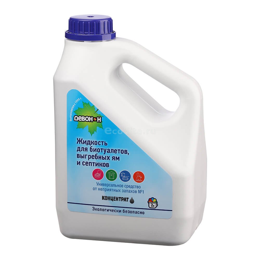 Концентрированное средство Девон-Н 2 литра - универсальный уничтожитель запахов широкого спектра действия в виде жидкого концентрата. Подходит для использования в дачных туалетах, выгребных ямах, для удаления рвотных, фекальных запахов (в садовых и дачных туалетах, а также от домашних животных), а также неприятных запахов гниения (например, в компосте). Разлагает и химически связывает все пахучие компоненты.