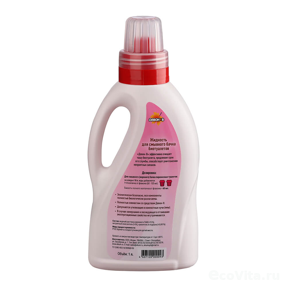 Ароматизирующий шампунь Девон-В 1 литр для верхнего (смывного) бачка биотуалета. Обеспечивает эффективное отмывание и очистку пластмассовых деталей туалета. Содержит компоненты, способствующие уничтожению запаха и разжижению фекальных масс в приемной емкости биотуалетов. Полностью совместим со средством Девон-Н (не препятствует уничтожению запахов в приёмной ёмкости биотуалета). Допускается утилизация в компостные ямы.