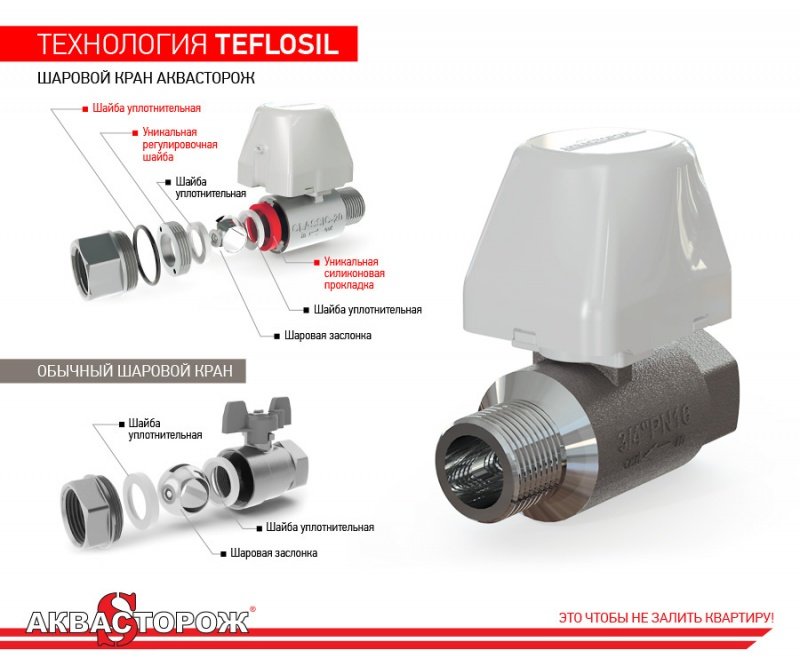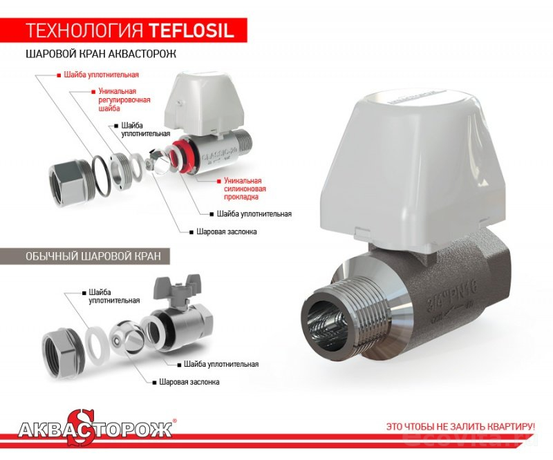"Умные краны" Аквасторож обладают высокой скоростью закрытия, прочным полнопроходным корпусом и полным контролем работоспособности.