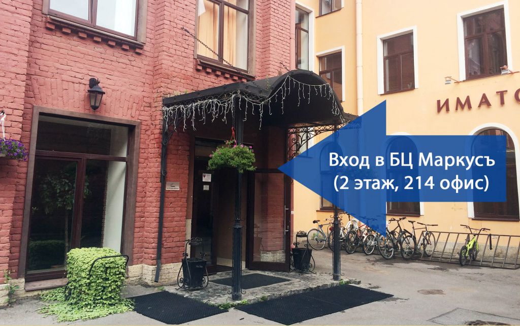 Вход в БЦ «Маркусъ» с 10-й линии. На линии вы увидите черные ворота. В конце двора слева будет проходная бизнес-центра. Для прохода на территорию БЦ необходимо предъявить документы. Поднимитесь по лестнице на второй этаж, поверните направо. В конце коридора находится наш офис №214.