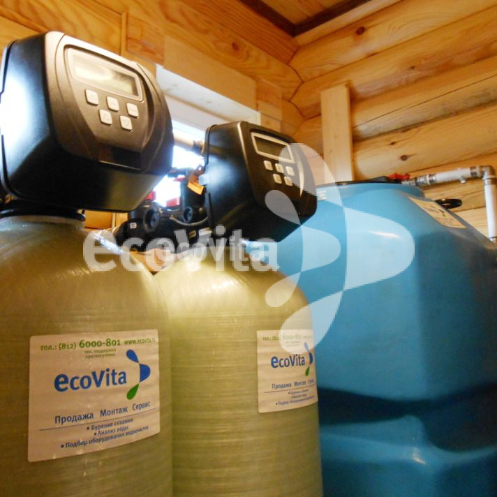 Система рассчитана на обеспечение стабильного давления в магистрали потребителя: выполнена при помощи 2-х накопительных баков и станции второго подъема Grundfos. Так как источник исходной воды это поселковый водопровод, система фильтрации рассчитана с учетом возможного ухудшения качества воды по следующим параметрам: перманганатная окисляемость и железо, а также мутность, цветность и органика.