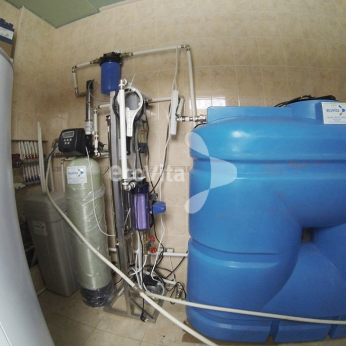 На входе воды в систему водоснабжения дома установлен фильтр с загрузкой из ионообменной смолы, необходимый для снижения содержания железа и жесткости в исходной воде. Далее установлен обратноосмотический фильтр производительностью 100 л/час. Так как производительность обратноосмотической системы не велика, далее установлена емкость, которая позволяет накапливать воду для ее дальнейшего использования. Подача воды из емкости производится насосной станцией Grundfos MQ 3-45. На выходе установлена ультрафиолетовая лампа, которая уничтожает все бактерии, которые могут образоваться в результате застаивания воды в накопительной емкости.