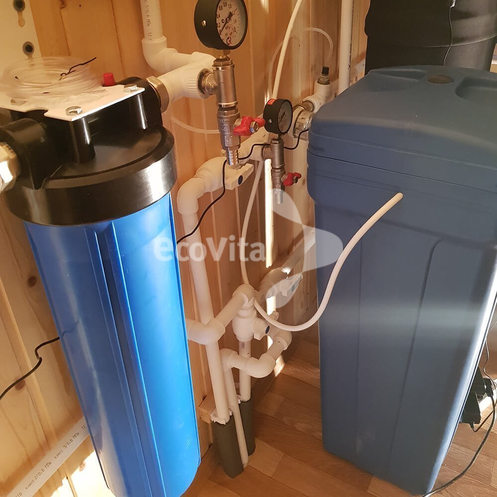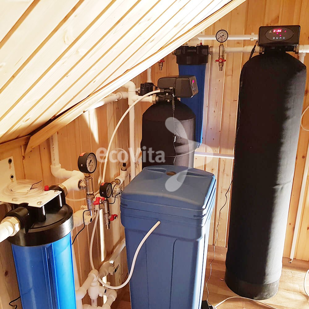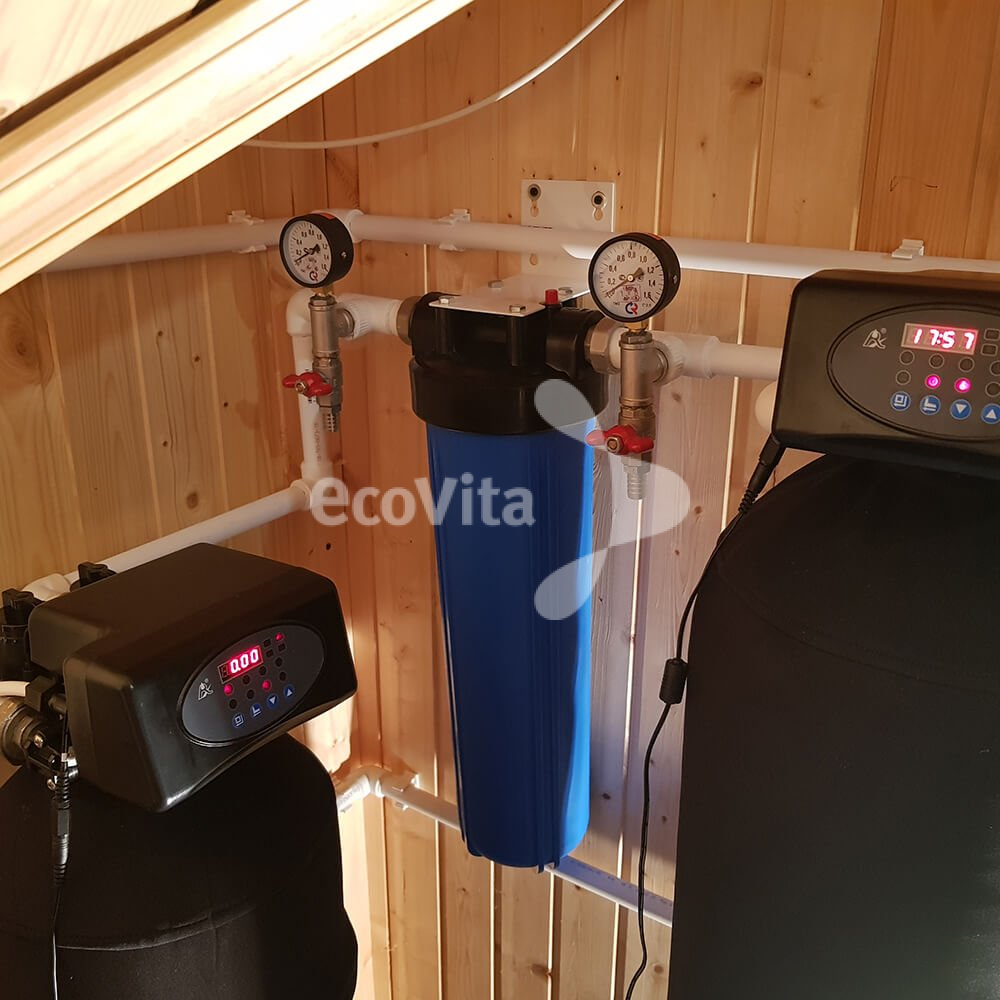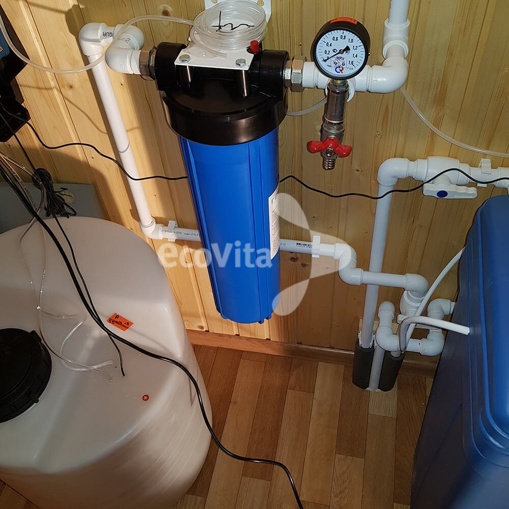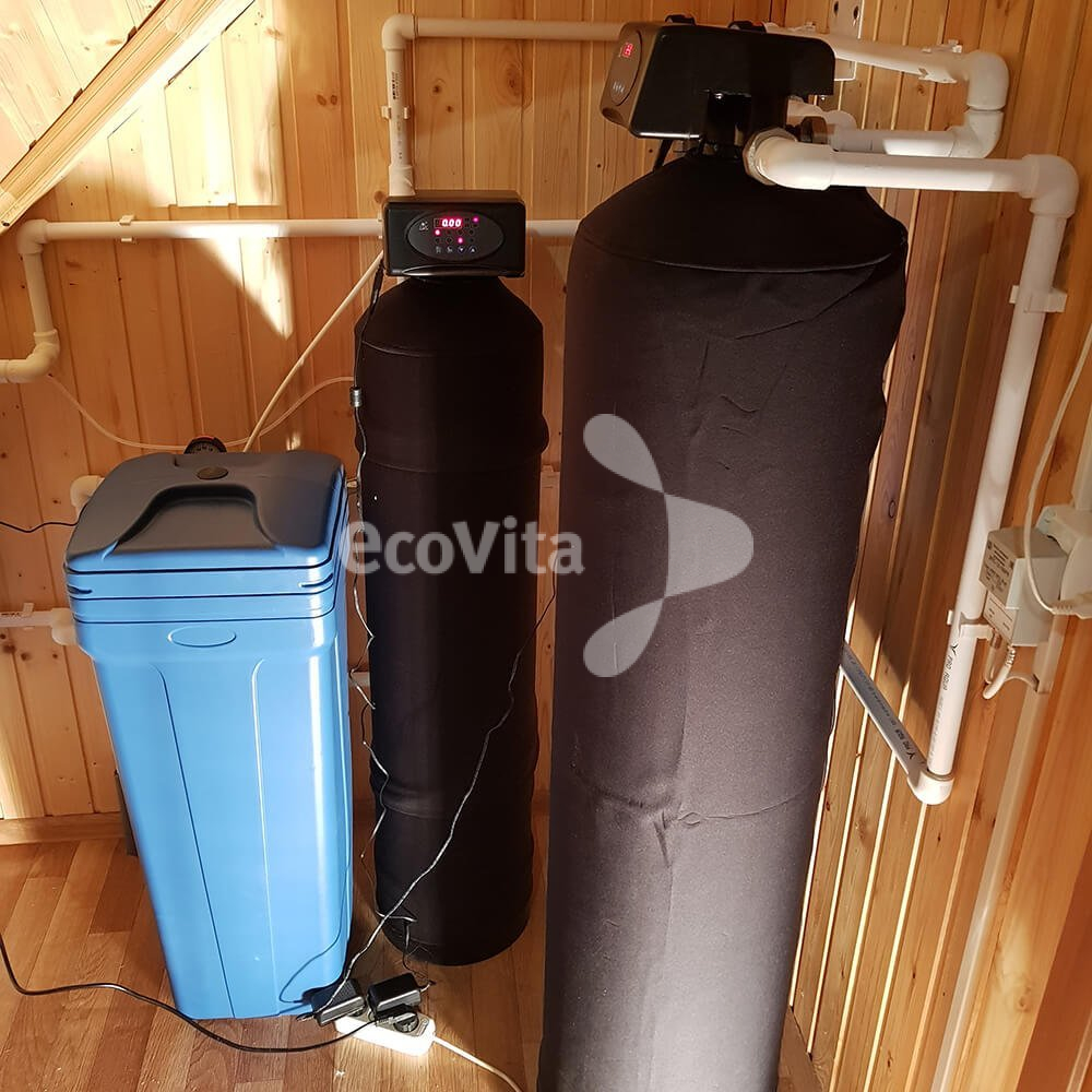 - Система фильтрации Ecovita EVF с автоматическим управлением установлена для удаления железа, марганца, сероводороад и механических взвесей.