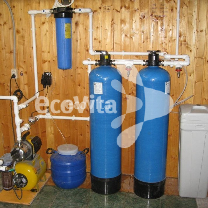 Основные проблемы, выявленные в результате анализа - повышенное содержание железа, марганца, высокая перманганатная окисляемость (показатель отвечающий за наличие органики в воде), превышение по мутности, цветности и запаху. Система очистки состоит из 2-ух напорных фильтров, насоса дозатора и фильтра механической очистки.