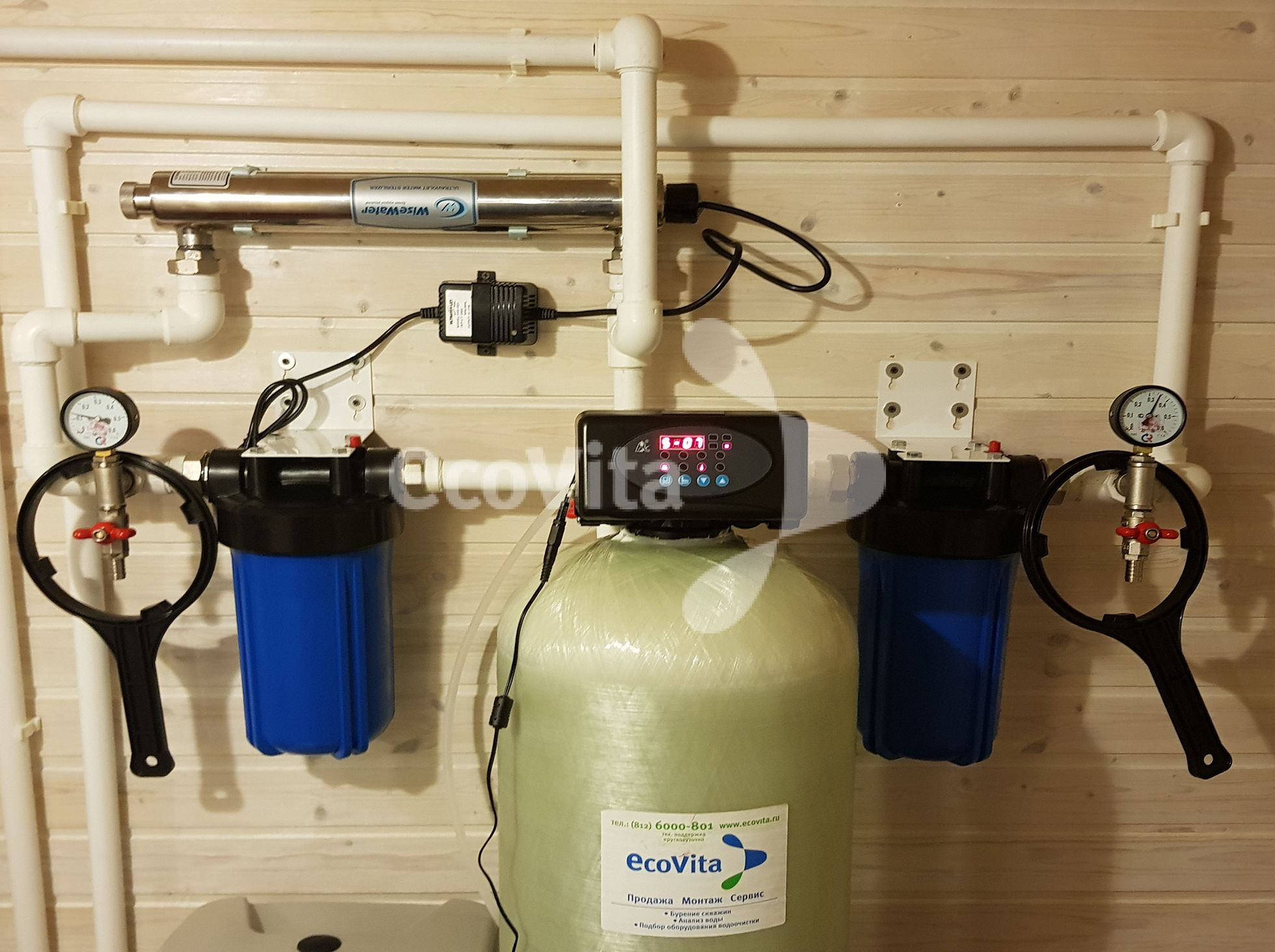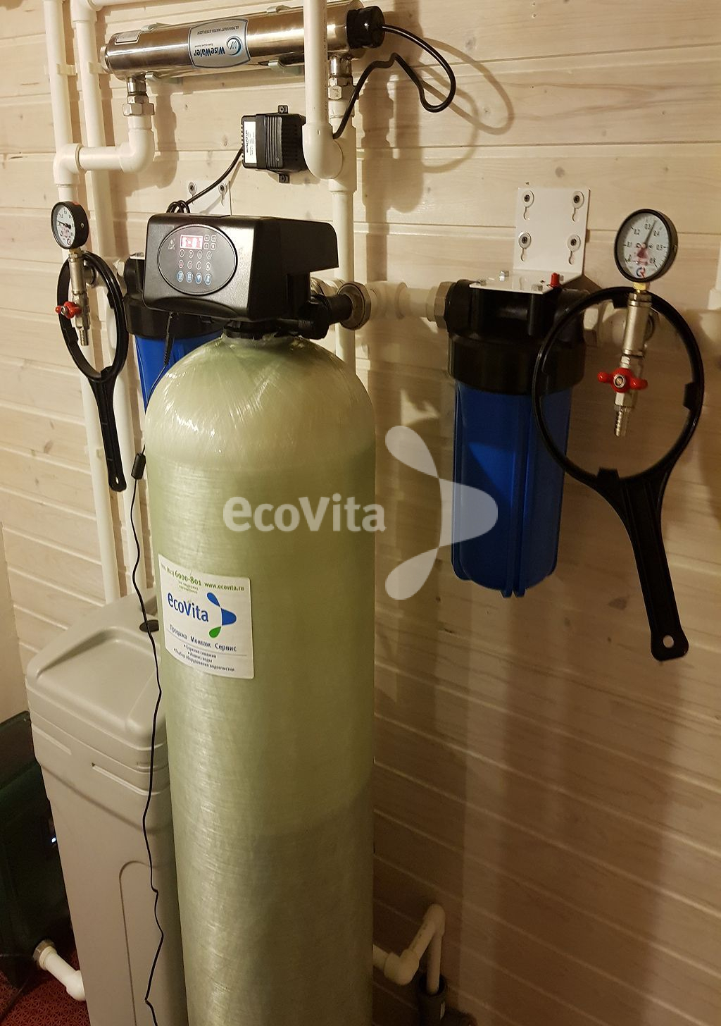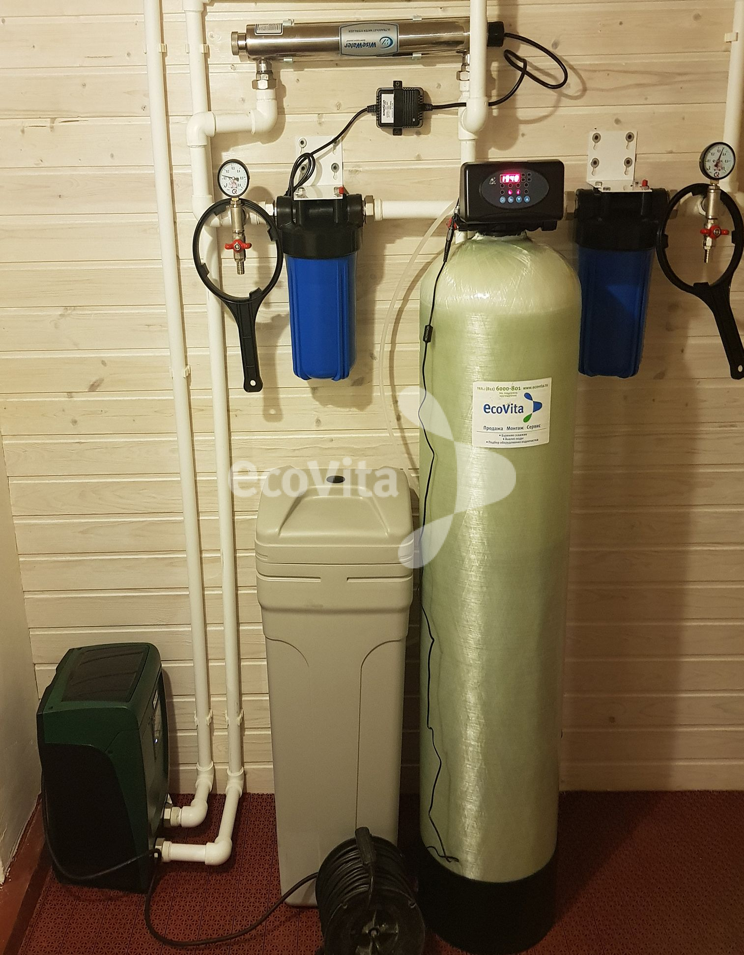 Установка системы обезжелезивания и умягчения воды для загородного дома.