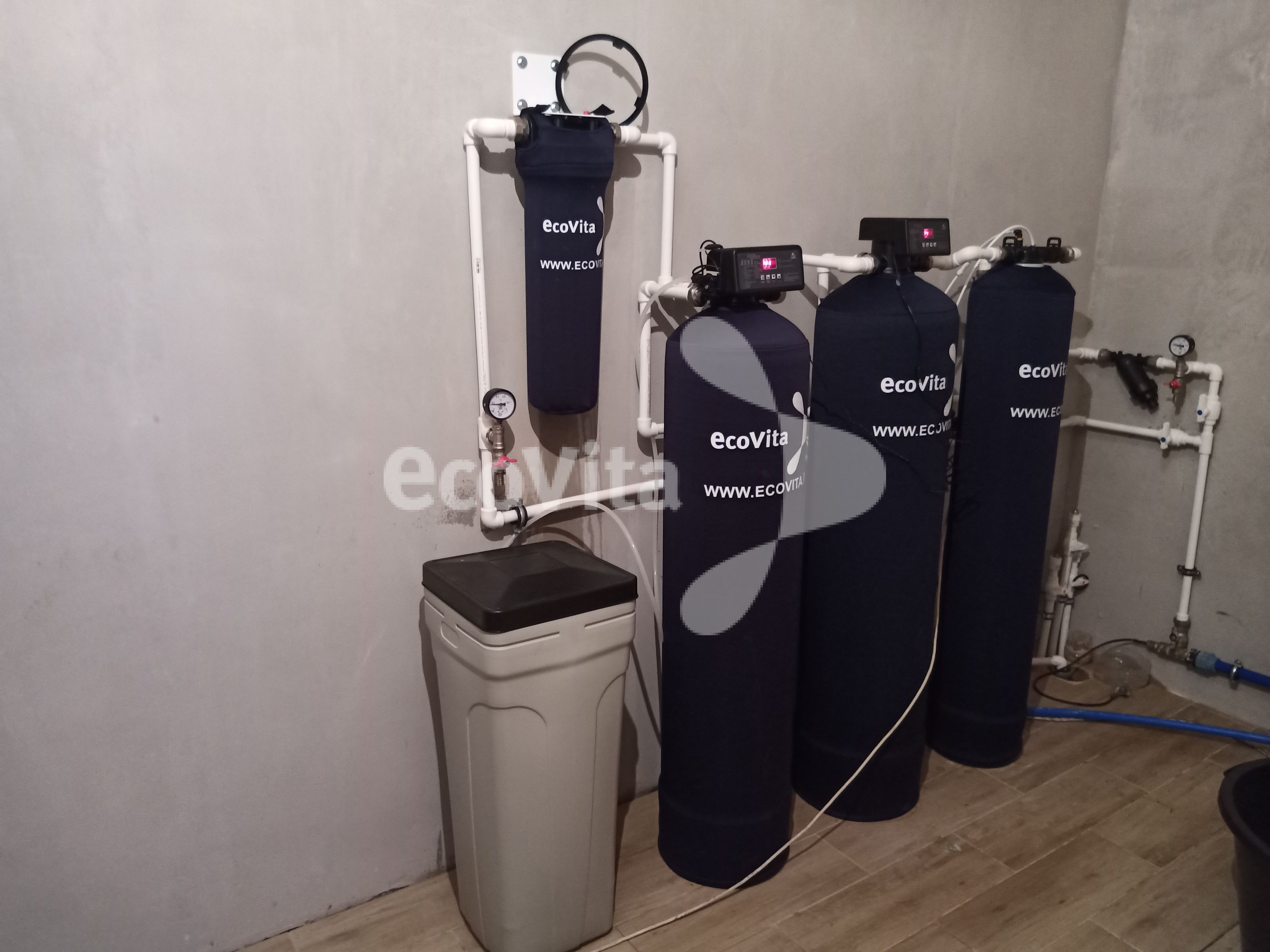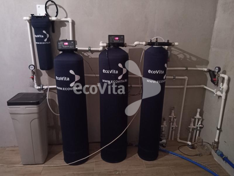 - Автоматический умягчитель Ecovita EVF 12 RM с ионообменной смолой Seplite SC 130 для снижения уровня жесткости воды;