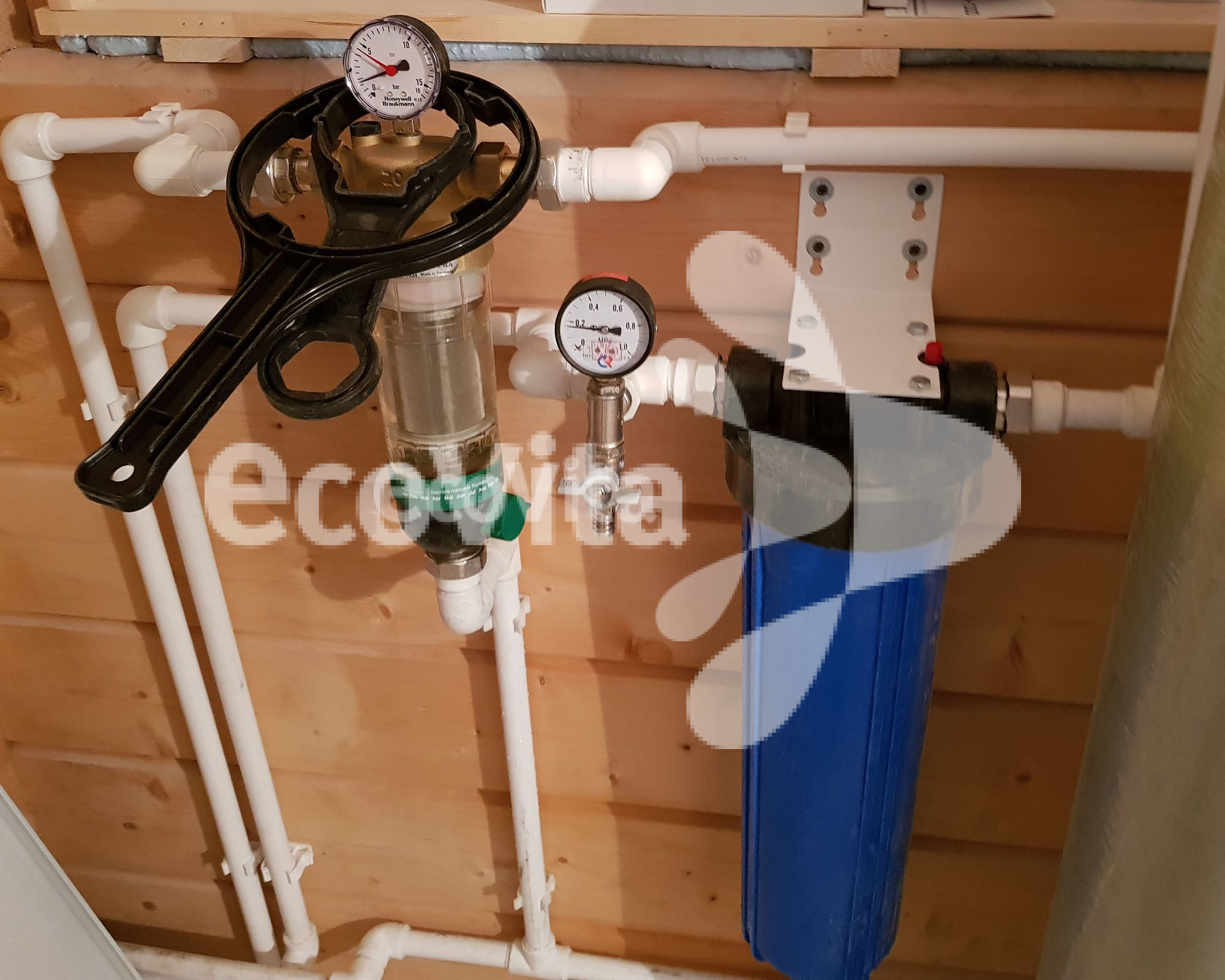 • На входе фильтр грубой механической очистки Honeywell F76S 3/4" AA с обратной промывкой для удаления крупных механических взвесей и защиты управляющего клапана засыпного фильтра;