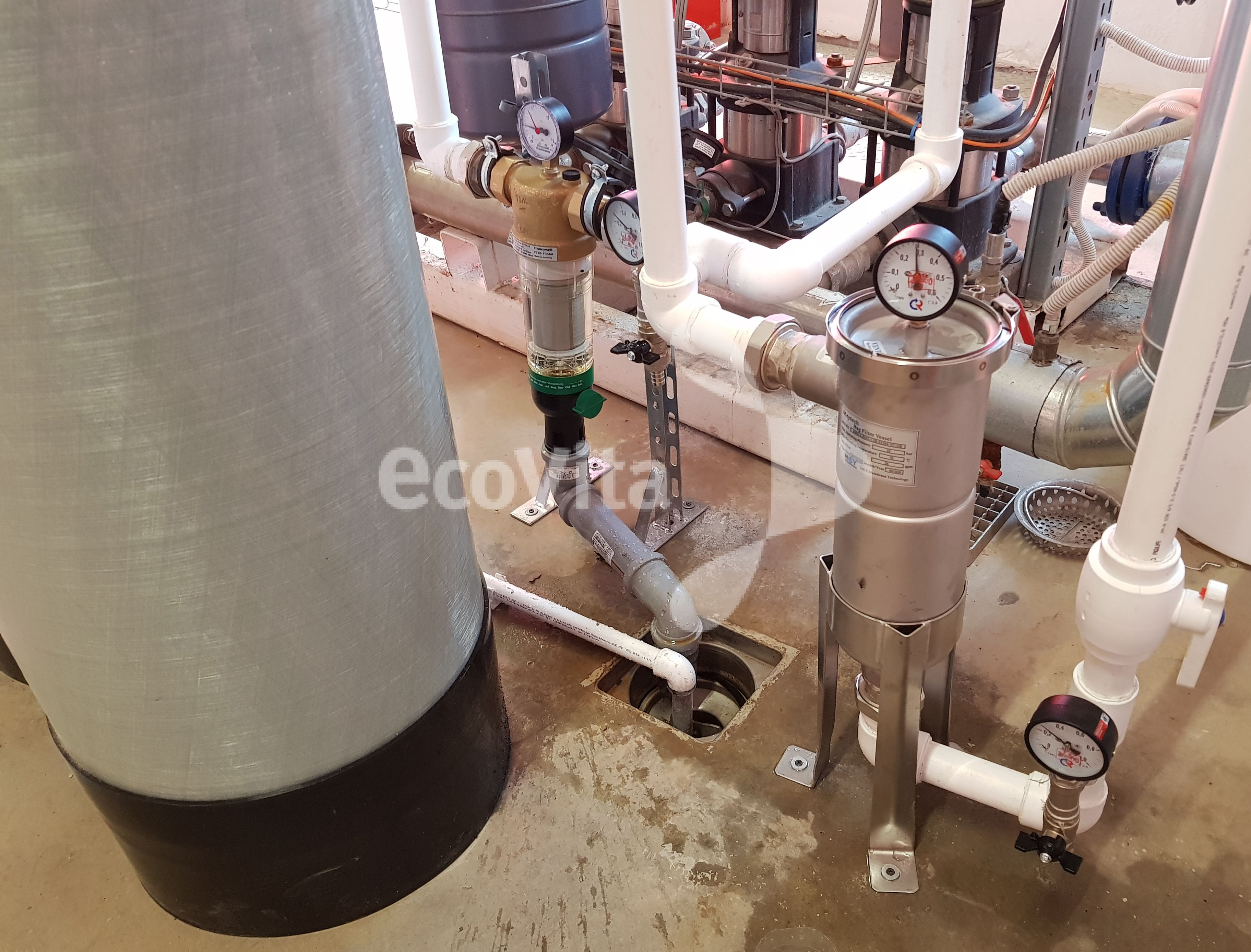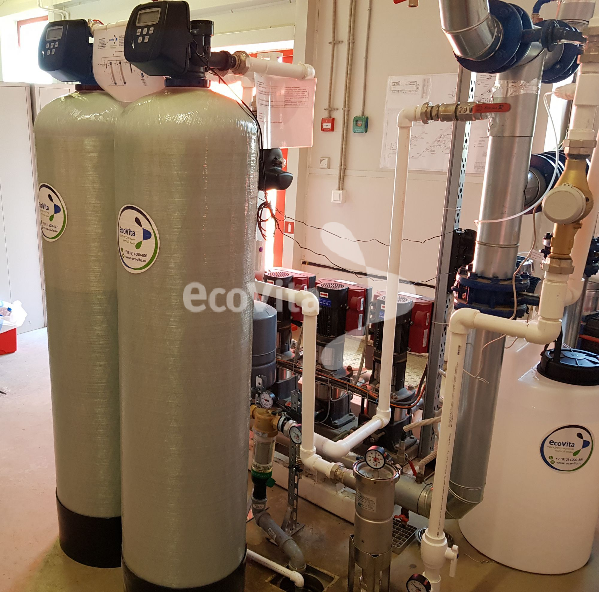 Монтаж системы очистки воды для пищевого производства. Заказчику требовалась очистка воды из системы городского водоснабжения с превышениями по показателям «мутность», «железо общее», до нормативов СанПиН 2.1.4.1074-01, а также снизить показатель воды «жесткость» и предотвратить появление коррозии в системе горячего водоснабжения.